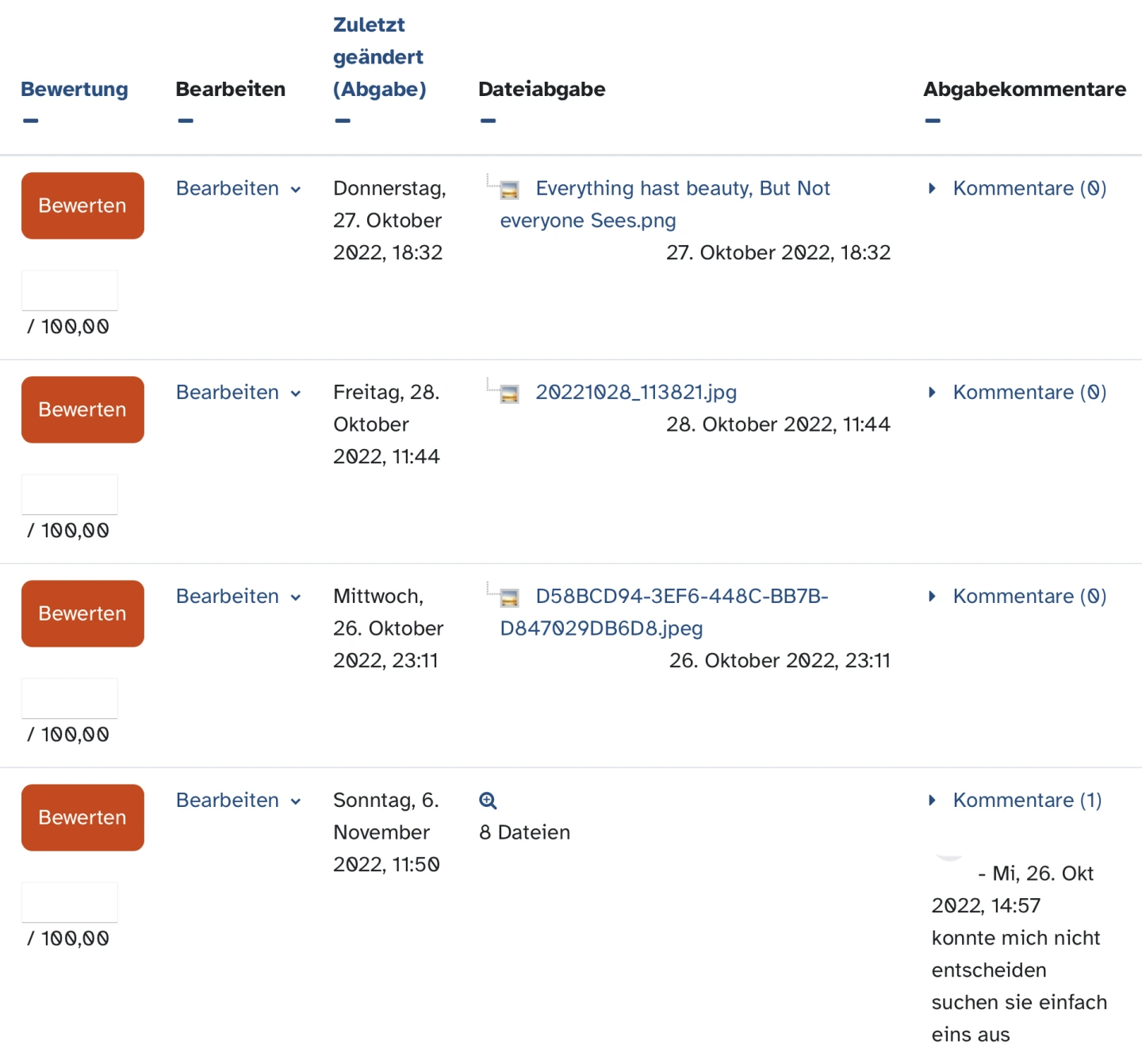 Schülerinnen und Schüler können sowohl Textdokumente, Präsentationsdateien, Tabellenkalkulationen, Screenshots, Fotos als auch verschiedene Video- und Audioformate hochladen.