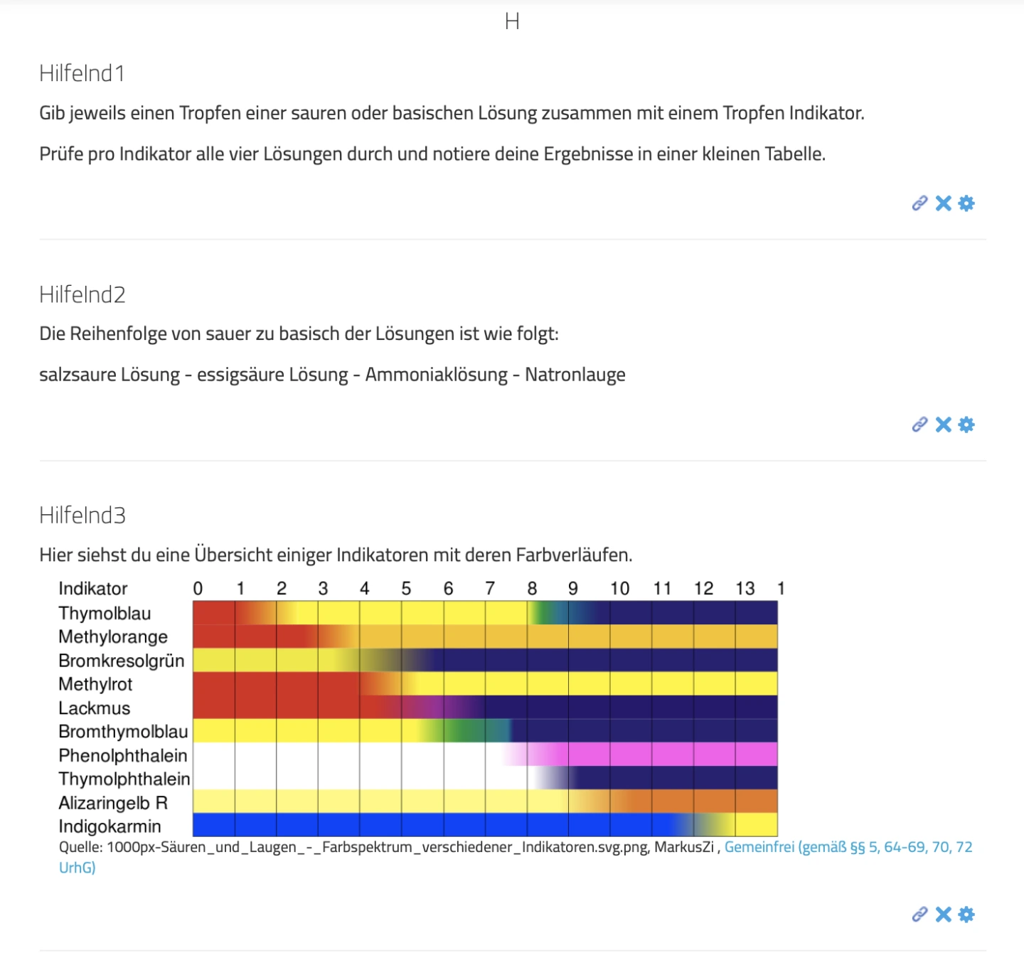 In Abbildung 1 sehen Sie ein Einsatzbeispiel: Im Anschluss an eine Aufgabenstellung sind hier die Begriffe HilfeInd1, HilfeInd2 und HilfeInd3 eingetragen. Dieselben Begriffe sind auch im Glossar eingetragen (Abb. 2). Nachdem im Glossar die automatische Verlinkung aktiviert wurde, werden die Begriffe im Text automatisch zu Links. Lernende haben dadurch die Möglichkeit, sich gestufte Hilfestellungen direkt anzusehen, die im Glossar beispielsweise als Text (Abb. 3) oder als Grafik (Abb. 4) hinterlegt worden sind.