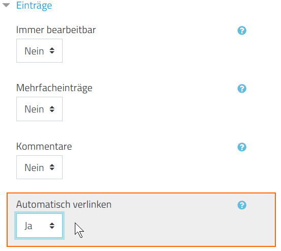 Zum Aktivieren der automatischen Verlinkung von Begriffen in einem Glossar im gesamten Kursraum müssen Sie nur eine kleine Voreinstellung verändern: Öffnen Sie zunächst das gewünschte Glossar und klicken rechts neben dem Namen des Glossars auf das Zahnrad-Symbol. Das Aktionsmenü öffnet sich. Klicken Sie nun auf „Einstellungen bearbeiten“. Die Einstellungen des Glossars können Sie alternativ auch direkt beim Anlegen dieser Aktivität anpassen. Die Einstellung zum Aktivieren der automatischen Verlinkung finden Sie in den Glossar-Einstellungen im Abschnitz „Einträge“. Wie im Screenshot zu sehen müssen Sie nun lediglich das Auswahlfeld neben „Automatisch verlinken“ auf „Ja“ umstellen. Speichern Sie die Änderungen anschließend unten auf der Seite.