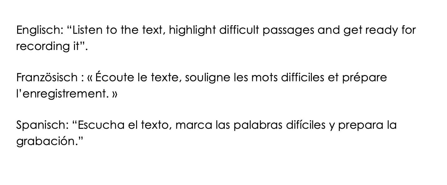 Jeder beliebige Lehrbuchtext kann verwendet werden, um Audios auf Grundlage der Inhalte zu produzieren. Sobald der Lehrbuchtext inhaltlich erarbeitet wurde, ergibt sich für (schnellere) Lernende die Möglichkeit, zu Hause oder in geeigneten Phasen des Unterrichts den behandelten Text selbst als Audio einzusprechen. Im Anschluss wird die Aufnahme für die Mitlernenden über eine geeignete Lernplattform zur Verfügung gestellt. Wird dieses Vorgehen einmal am Schuljahresanfang eingeübt, kann es über das Schuljahr hinweg selbstständig von den Lernenden fortgeführt werden und dient so der zusätzlichen Vertiefung von Unterrichtsinhalten sowie darüber hinaus der Differenzierung.