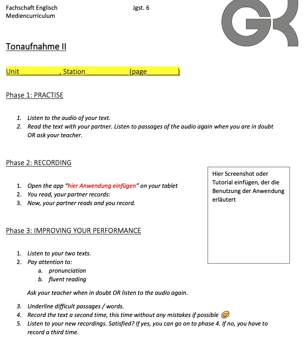 Das Aufnehmen der Audios kann zu Hause geschehen, ist aber auch während der Unterrichtsstunde als Differenzierung möglich. Dabei ist zu beachten, dass die Aufnahme von Audiodateien einen gewissen Geräuschpegel mit sich bringt und dadurch auch nicht im Klassenzimmer von allen Lernenden gleichzeitig durchgeführt werden kann. Es empfiehlt sich daher, einzelne Schülerinnen oder Schüler in einen vorher klar definierten Bereich außerhalb des Klassenzimmers zu schicken, um die Audioaufnahme ohne Störgeräusche durchführen zu können.