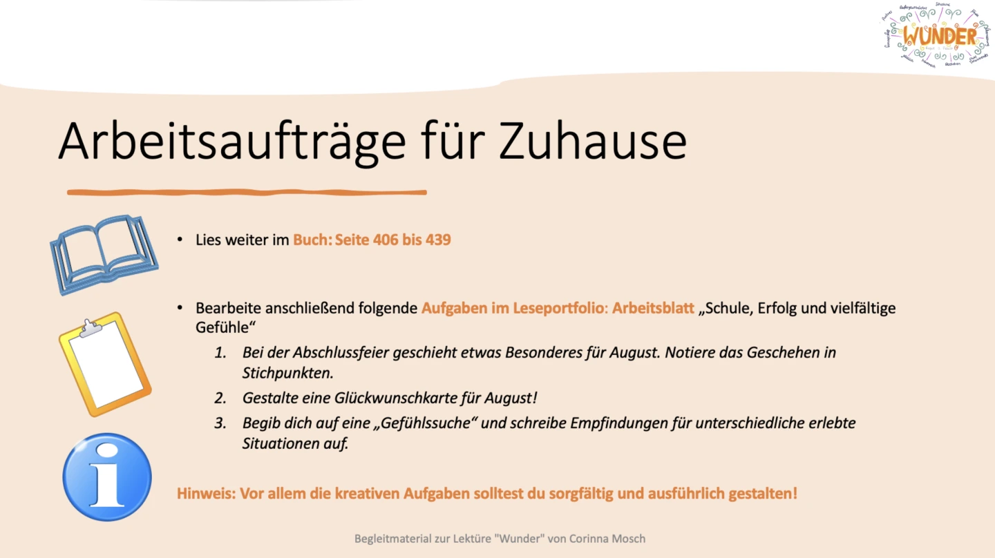 Während der Behandlung einer Klassenlektüre kann ein Großteil des Lesens zu Hause, in Form von zeitlich abgegrenzten Leseaufträgen (z. B. kapitelweise, Seite X bis Y, ...) erfolgen. Der Unterricht wird vornehmlich dazu genutzt, die Inhalte der Lektüre zu besprechen und durch geeignete Aufgaben in Form eines Leseportfolios zu vertiefen.
