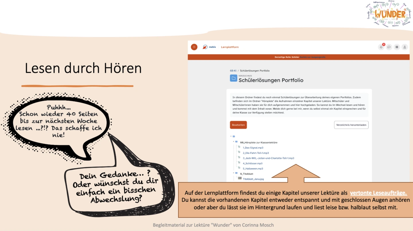 Die von den Freiwilligen produzierten Hörspiele schaffen Entlastung: Durch die Möglichkeit des „simultanen Lesens und Hörens“ (Vgl. S. Gailberger, S. 201) können die Schülerinnen und Schüler die „aufgesparte“ Zeit in die Bearbeitung der Portfolioaufgaben investieren.