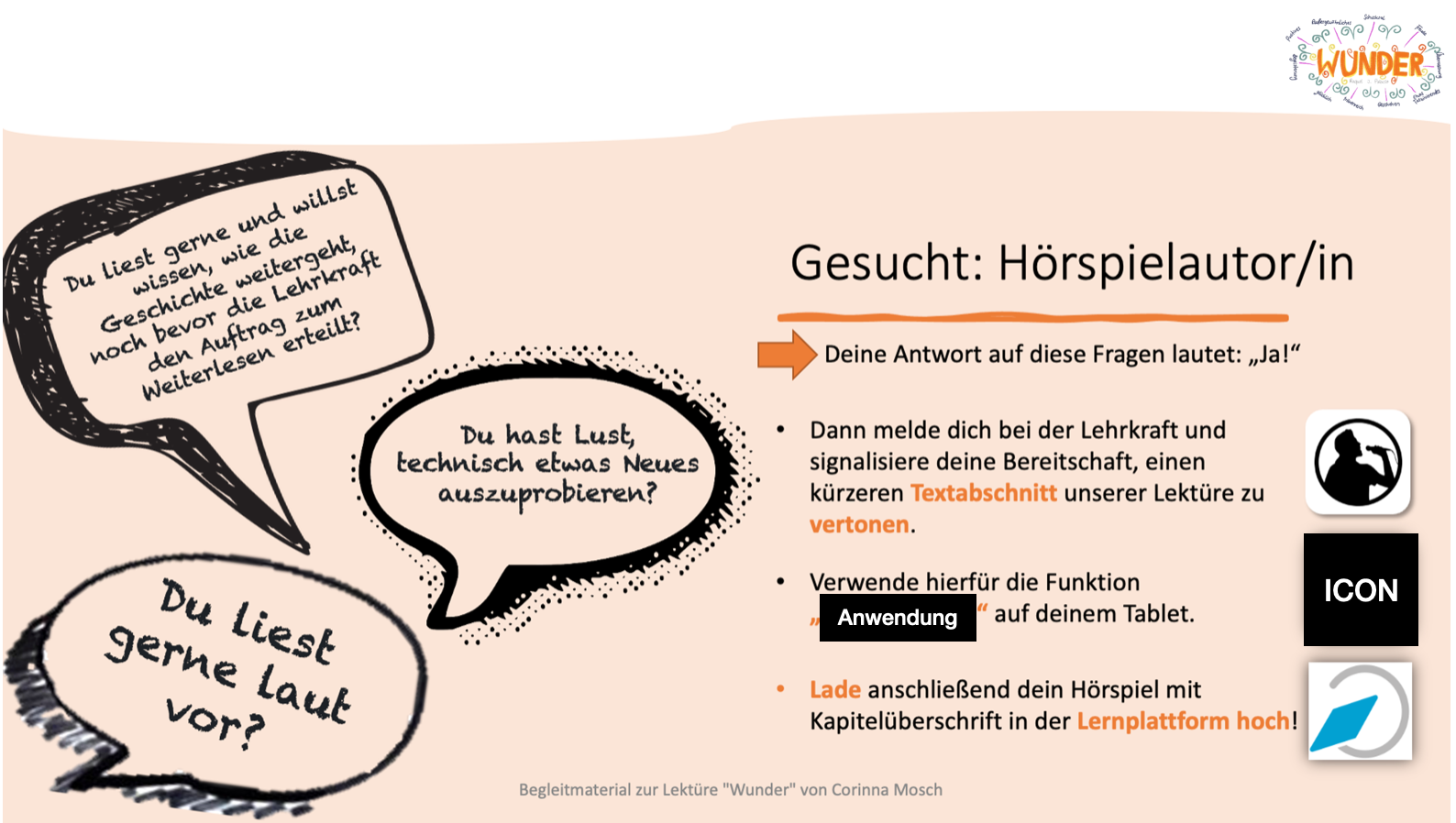 In Bezug auf die hier beschriebene Vorgehensweise erscheint es nicht zielführend, das gesamte Buch zu vertonen, sondern lediglich gelegentlich eine Passage, sodass im Wechsel gelesen und gehört werden kann und ein Fortschreiten im Textverlauf auch für leseschwächere Schüler und Schülerinnen leichter möglich ist.