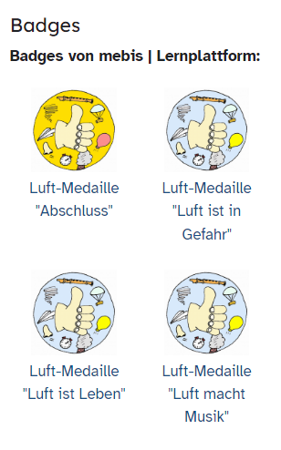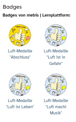 Sie haben eine Lerneinheit in mebis zum Thema „Luft“ erstellt, die mehrere Lernaktivitäten enthält. Zu diesen können Materialien zur Erarbeitung gehören genauso wie Sicherungs- und Übungsaufgaben. Nach dem Bearbeiten aller Aufgaben erhalten Schülerinnen und Schüler ein Badge, der grafisch zum Thema passt.