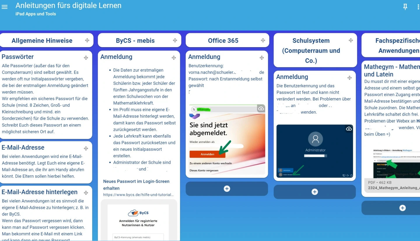Hier finden sich Anleitungen, Informationen zu Anmeldungen und Ansprechpartnerinnen bzw. -partner bei weiterführenden Fragen. Auf digitalen Pinnwänden kann alles übersichtlich und multimedial dargestellt werden. Bei Änderungen ist man sehr flexibel. Die Pinnwand kann in leicht angepassten Varianten auch Lernenden oder Erziehungsberechtigten eine große Hilfe sein.