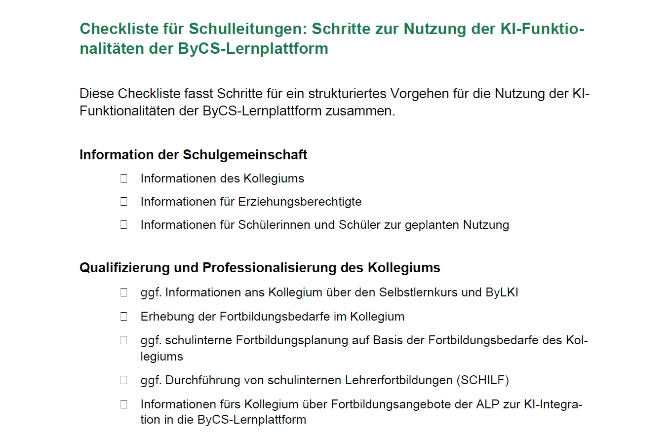 Checkliste für Schulleitungen: Schritte zur Nutzung der KI-Funktionalitäten der ByCS-Lernplattform