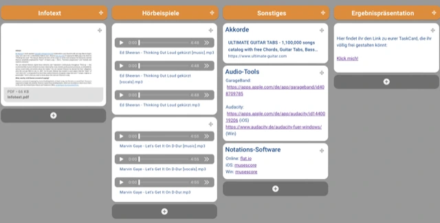 Bereitstellung der Arbeitsmittel: Neben dem Arbeitsauftrag finden sich auf der Pinnwand noch weitere Informationen und Arbeitsmittel. Dazu gehören die jeweiligen Hörbeispiele, Notenbeispiele (ggf. werden diese auch selbst erarbeitet!), Links zu Notations- und Audioschnittsoftware.