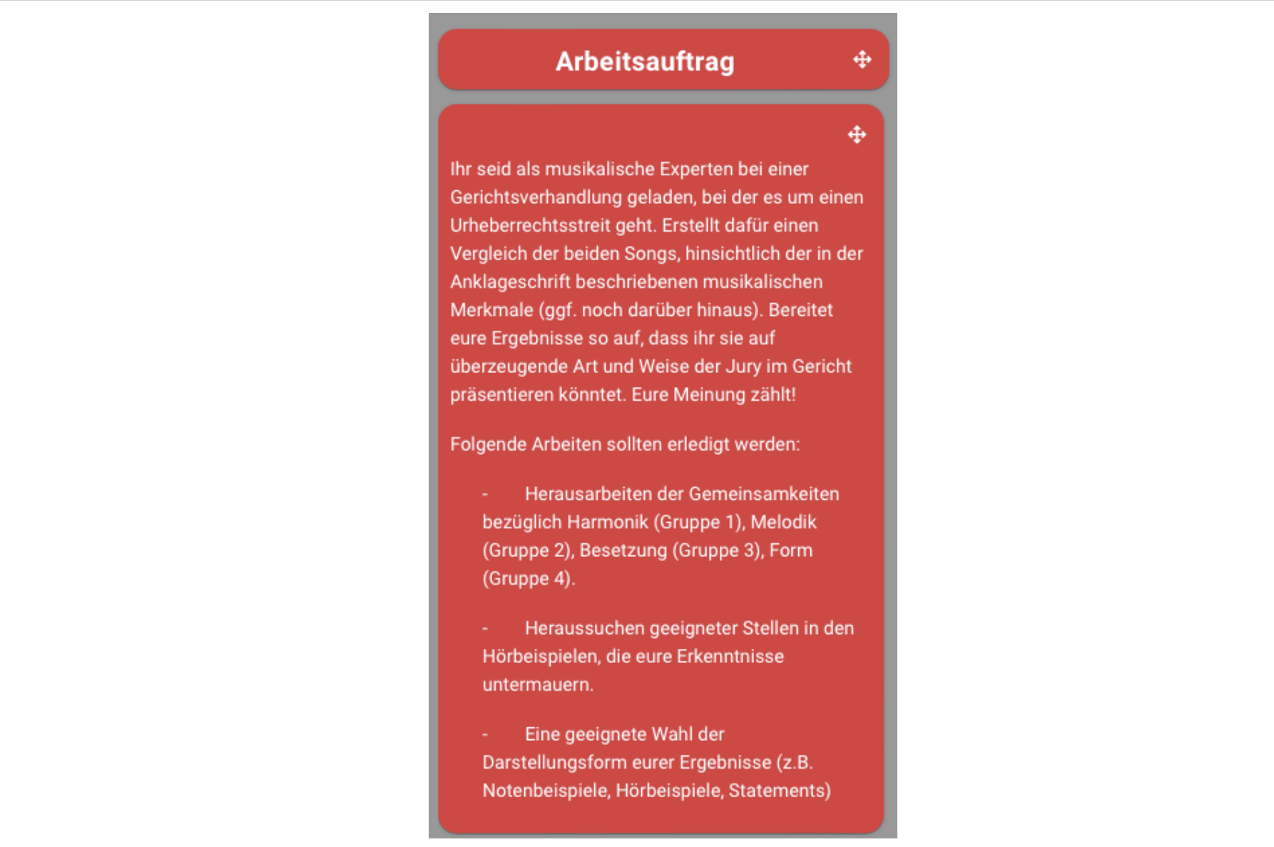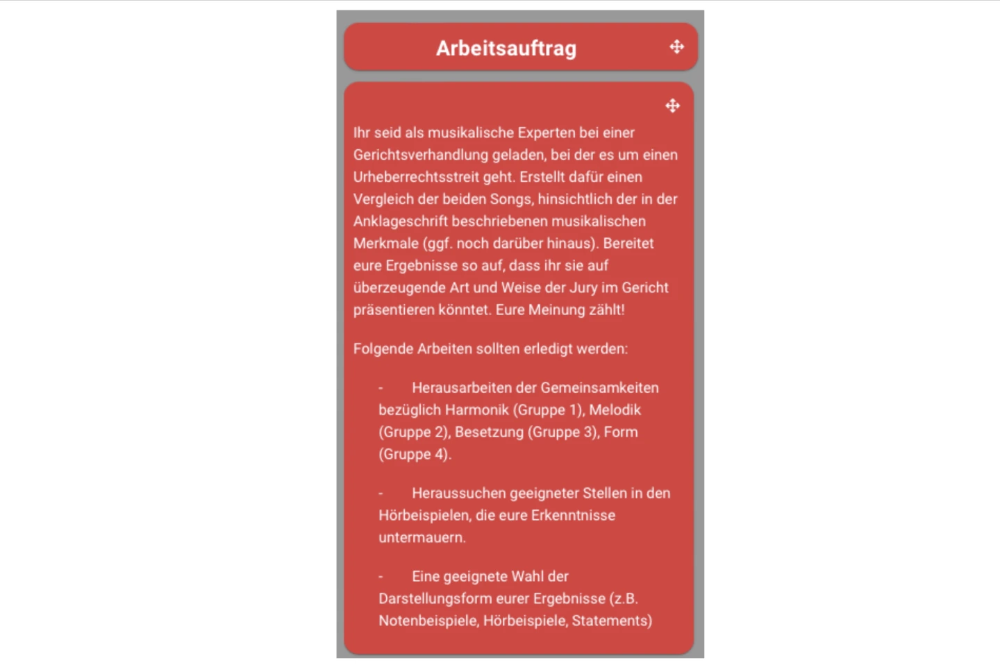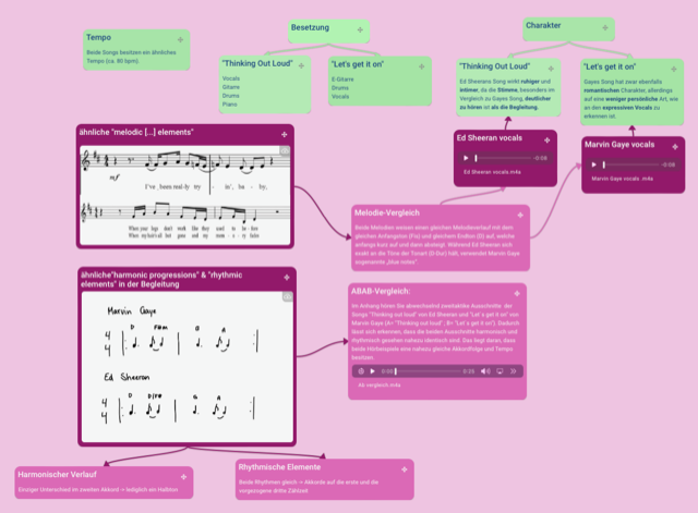 Die verschiedenen Parameter der Analyse sollten dabei auf Kleingruppen (max. vier Personen) aufgeteilt werden, welche ihre Ergebnisse auf einer digitalen Pinnwand festhalten. Die Ergebnisse können mit Noten- und Hörbeispielen verknüpft werden, um eine übersichtliche und optisch ansprechende Präsentation zu ermöglichen. Zudem lassen sich die Ergebnisse über einen längeren Zeitraum hinaus orts- und zeitunabhängig weiter gestalten und überarbeiten.