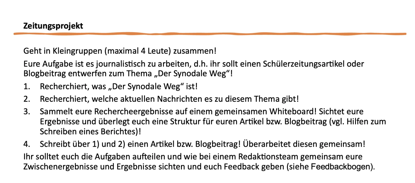 Die Schülerinnen und Schüler werden in Kleingruppen eingeteilt und erhalten den Auftrag zum Thema „Synodaler Weg“ zu recherchieren. Sie sollen dazu ein Online-Whiteboard oder eine Notiz-App verwenden, auf dem/der sie ihre Rechercheergebnisse sammeln und strukturieren können.