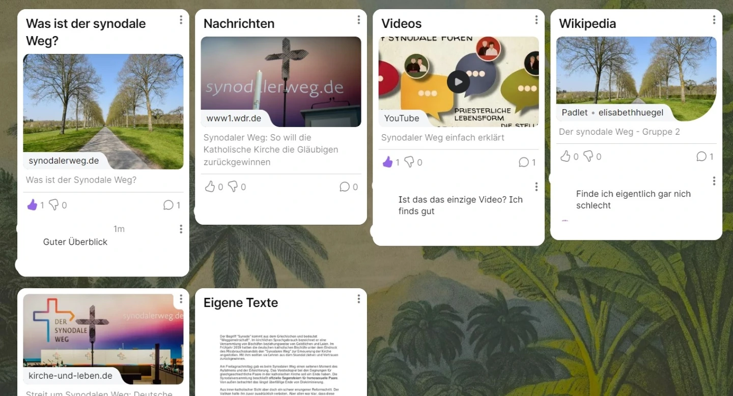 Die Schülerinnen und Schüler recherchieren zum Synodalen Weg und sammeln gemeinsam Informationen zum Hintergrund und den Beschlüssen auf einem Online-Whiteboard oder einer Notiz-App. Anschließend erstellen sie einen Artikel oder Blogbeitrag zum Thema „Synodaler Weg“, indem sie kollaborativ bzw. kooperativ das Endprodukt erarbeiten.