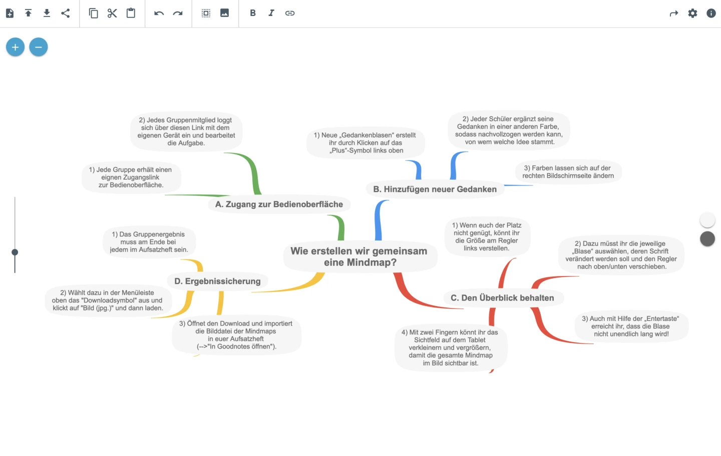Zunächst ist es erforderlich, die Lernenden in den wichtigsten Funktionen des gewählten Mindmapping-Tools zu unterweisen. Die Grafik zeigt die Bedienoberfläche des gewählten Werkzeugs mit einer bereits erstellten Mindmap zu den wichtigsten Grundfunktionen und Regeln, denen die Schülerinnen und Schüler bei der eigenen Arbeit mit dem Tool Beachtung schenken sollen. Im vorliegenden Unterrichtsbeispiel demonstrierte die Lehrkraft die Arbeit mit dem Werkzeug anhand einer zum Teil vorgefertigten Mindmap (vorhanden waren die Punkte A. und D. mit Unterpunkten), sodass die Lernenden die Funktionen unmittelbar nachvollziehen konnten.