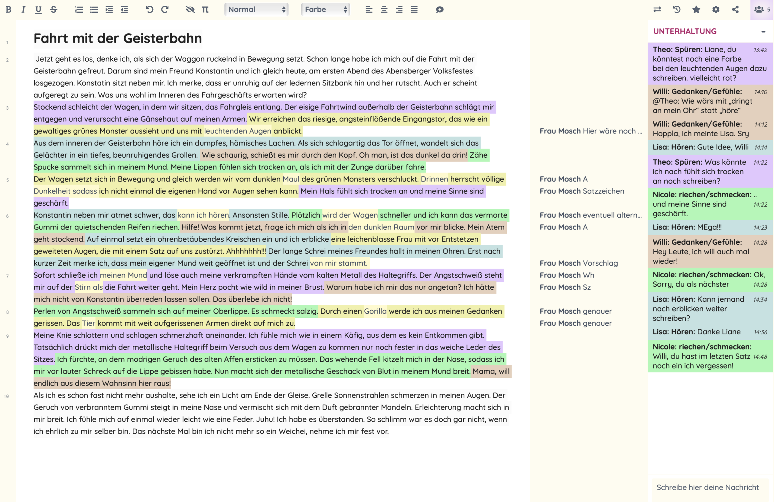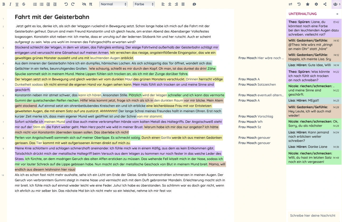 Durch die Zuordnung einzelner Farben pro Schüler bzw. Schülerin können sowohl die übrigen Gruppenmitglieder als auch die Lehrkraft nachvollziehen, in welchem Umfang sich die einzelnen Beteiligten in das gemeinsame Ergebnis einbringen bzw. eingebracht haben.