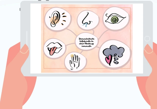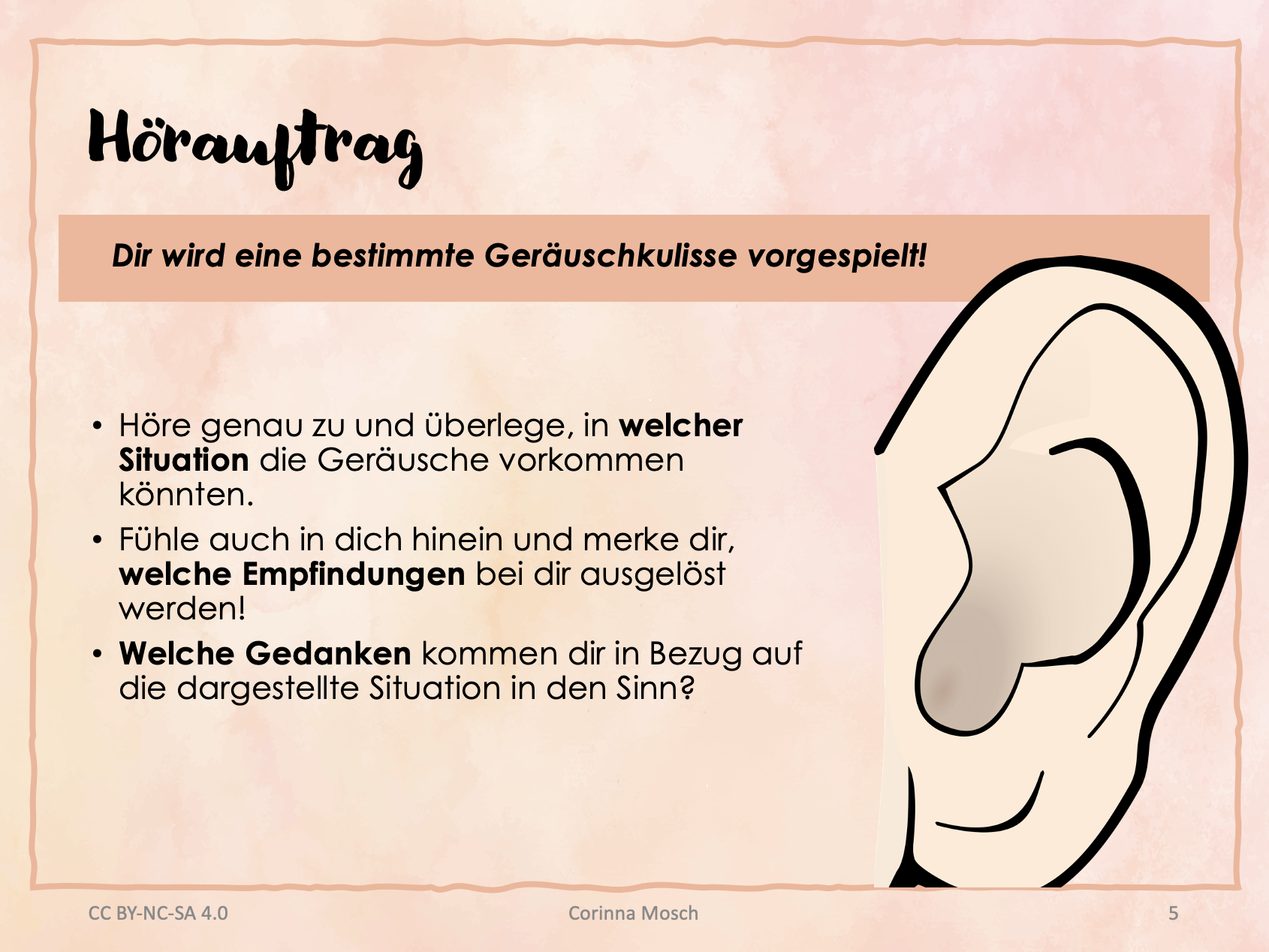 Durch einen auditiven Impuls werden die Lernenden zunächst auf die Situation eingestimmt, zu der sie im Anschluss gemeinsam Sinneswahrnehmungen, Gedanken und Gefühle in einer Mindmap sammeln sollen.