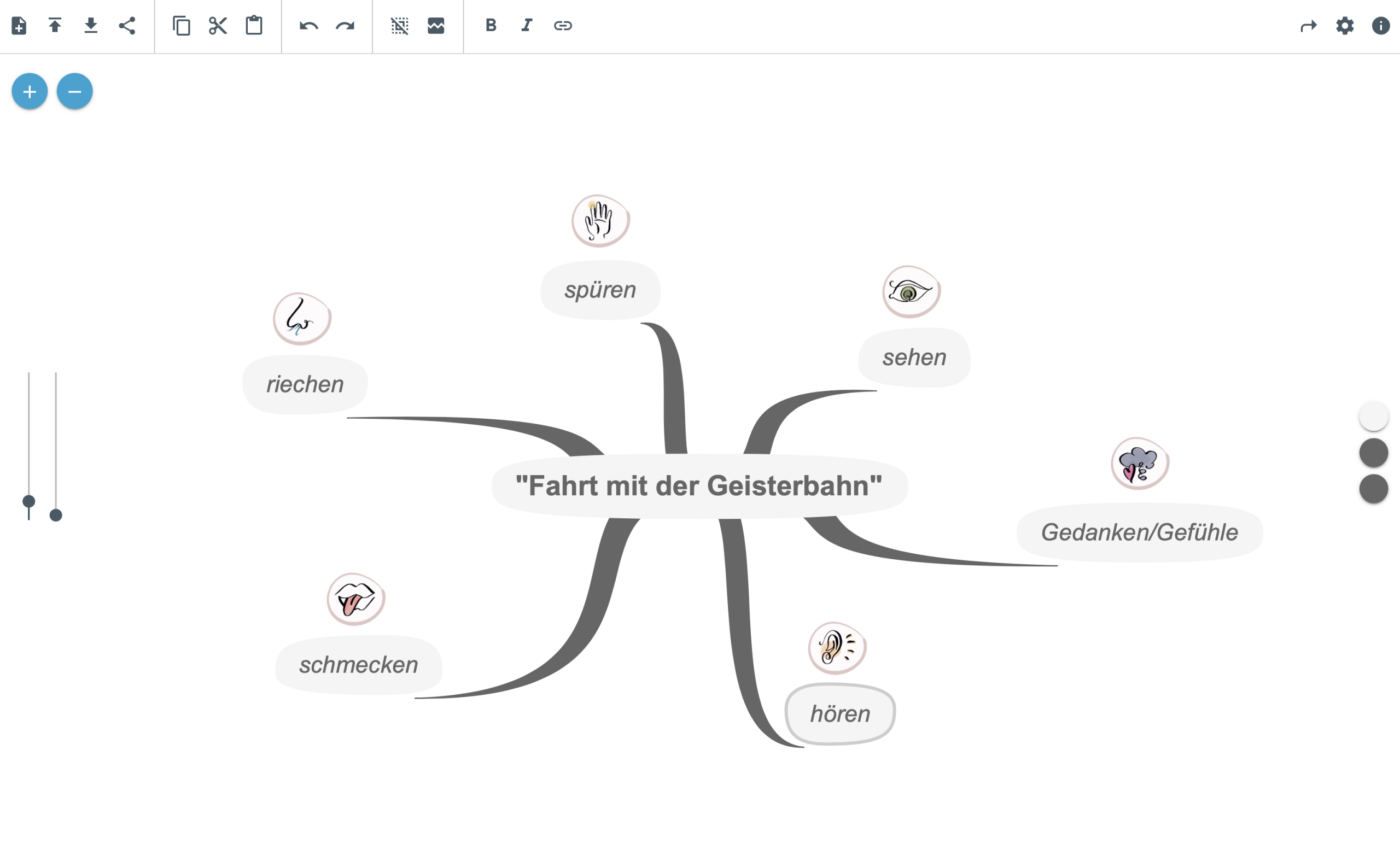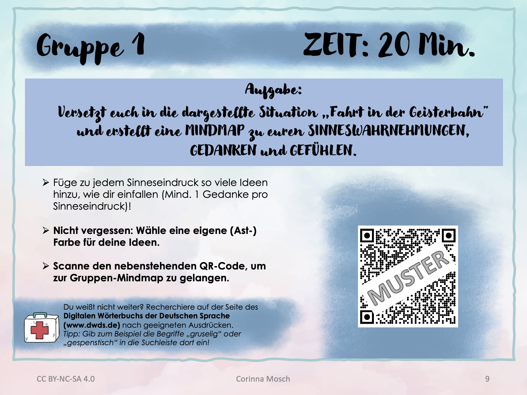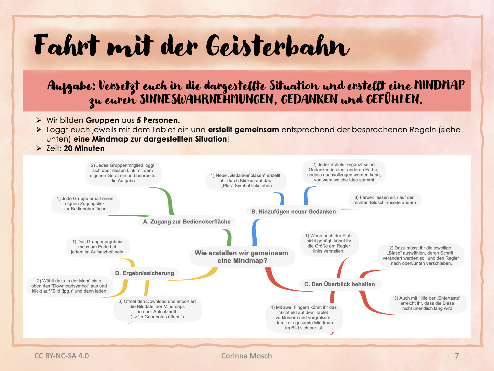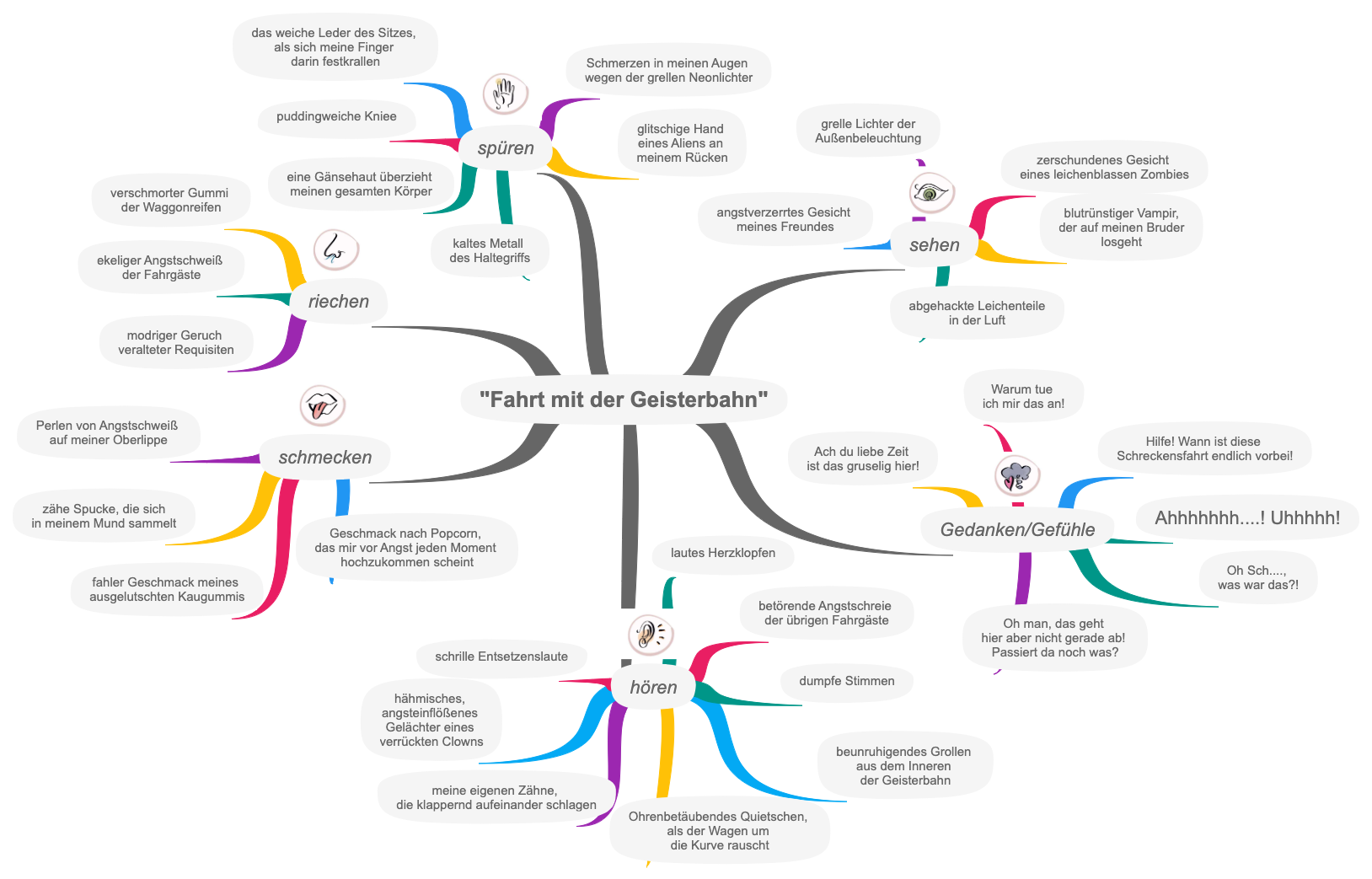 Die vorliegende Unterrichtseinheit zielt auf die gemeinsame Sammlung verschiedener Sinneswahrnehmungen, Gedanken und Gefühle zur Situation „Fahrt in der Geisterbahn“ ab. Dabei arbeiten die Lernenden in Gruppen aus bis zu fünf Personen und sammeln mit einem digitalen Mindmapping-Tool kollaborativ ihre Eindrücke zum dargestellten Ereignis.