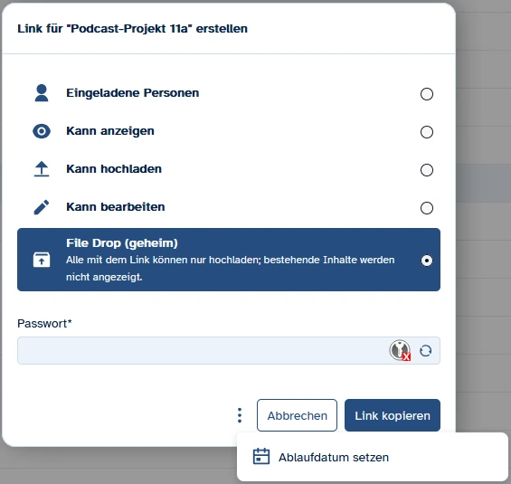 Es wird ein Ordner in „Persönliches” erstellt, in welchem die Audiodateien, welche eindeutig mit den Schülernamen benannt werden sollen, hochgeladen werden. Die Freigabe erfolgt durch einen Link mit dem Recht „File drop (geheim)” samt Passwort, wobei beides über den ByCS-Messenger kommuniziert wird. Der Link wird außerdem mit dem Abgabedatum als Ablaufdatum versehen, sodass danach keine weiteren Abgaben mehr möglich sind.