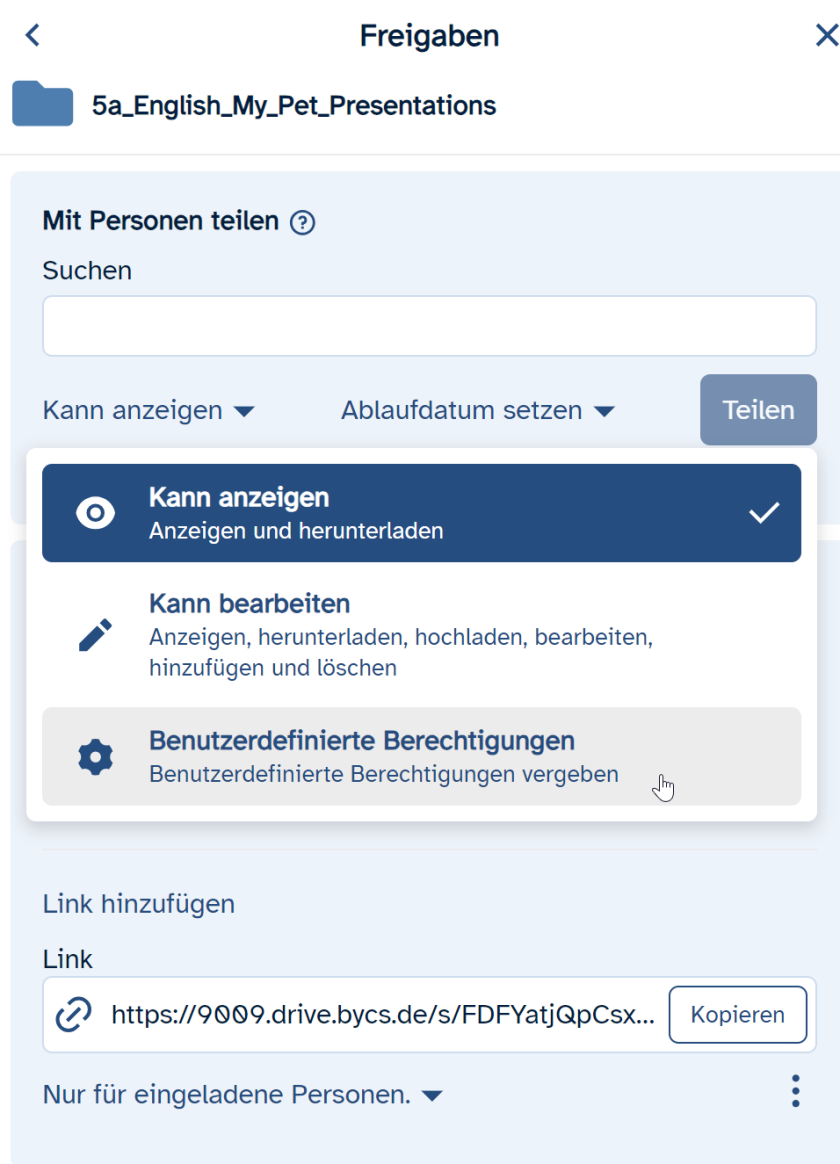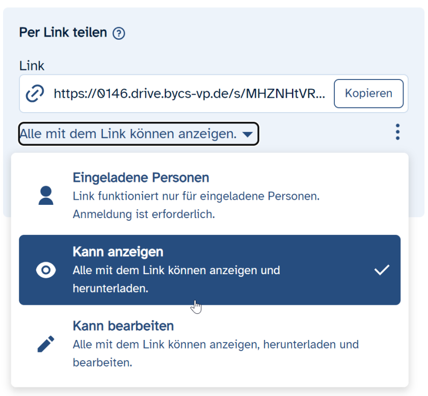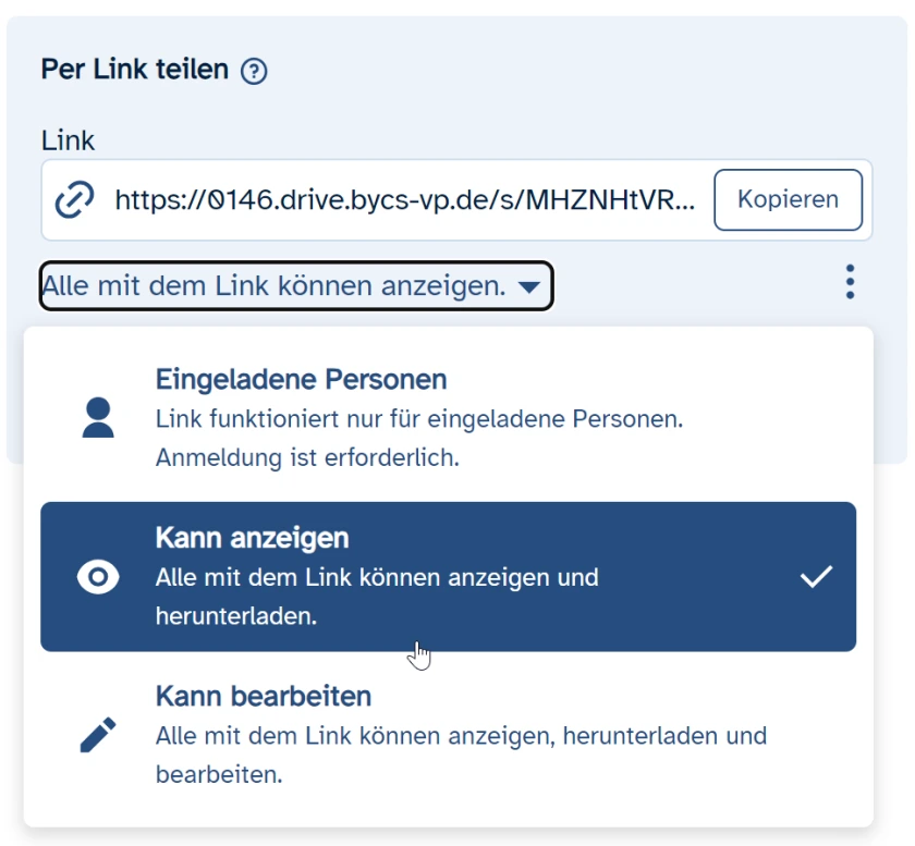 Durch die Freigabe einzelner Dateien, die z. B., im Ordner „Persönlich” hinterlegt sind, können sowohl Schülerinnen und Schüler ohne vorherige Anmeldung als auch Externe ohne ByCS-Account über einen Link mit einem Passwort („Per Link teilen”) von jedem Endgerät auf die Dateien zugreifen. Vorteil hierbei ist, dass die mit dem Link geteilte Datei jederzeit aktualisiert und überarbeitet werden kann. Bei der Erstellung des Links kann entschieden werden, welche Bearbeitungsrechte („Kann anzeigen” bzw. „Kann bearbeiten”) mit diesem einhergehen.