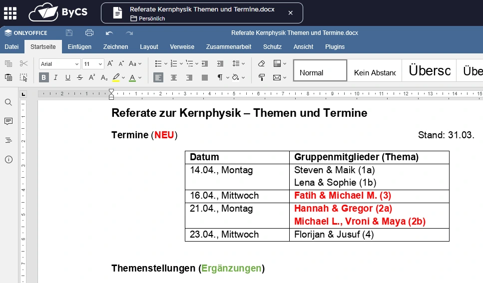 Verschiebungen in den Terminen oder Präzisierungen der Themenstellung bzw. Vorgaben werden von der Lehrkraft direkt im Dokument mittels ByCS-Office eingetragen.