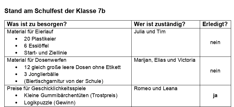 Für das Schulfest wollen die Schülerinnen und Schüler einen Stand machen, an welchem sie neben Geschicklichkeitsspielen auch kleine Tüten mit Süßigkeiten anbieten wollen. Die Einkäufe und andere Aufgaben sollen auf alle verteilt und in einer Tabelle festgehalten werden. Neben der Arbeit im Dokument findet die Kommunikation im ByCS-Messenger im Klassenraum der Klasse statt.