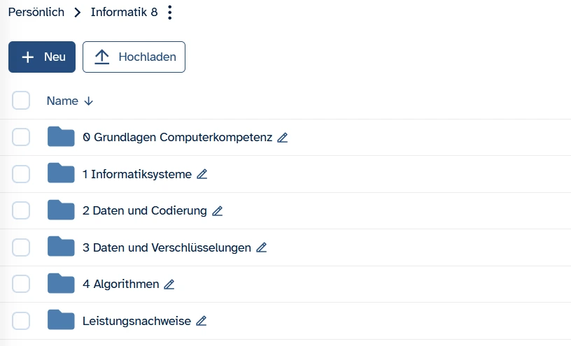 Im Beispiel handelt es sich um einen Space für den Mathematikunterricht einer 8. Klasse bei der Lehrkraft „BOS”. Der Space wurde mit den Recht „Kann anzeigen” mit der ganzen Klasse geteilt. Zu Unterordnern können die Schülerinnen und Schüler der Klasse nochmals durch eine Freigabe mit erweiterten Rechten eingeladen werden. Das kann nötig sein, wenn die Lernenden Dateien bearbeiten oder hochladen können sollen.