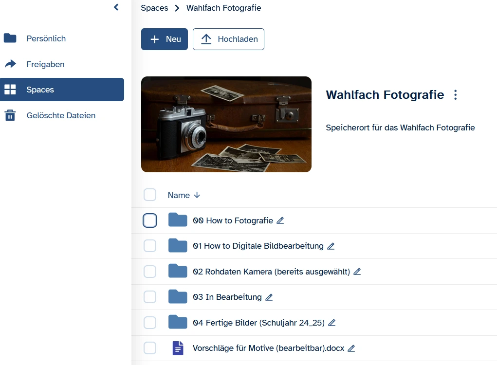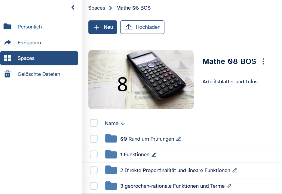 Anstelle der Bereitstellung von Unterrichtsmaterialien über persönliche Ordner im Bereich „Persönliches“ können auch sogenannte „Spaces“ genutzt werden. Dabei handelt es sich um schulgebundene Arbeitsbereiche in ByCS Drive, die nicht an die Person gebunden sind, die sie erstellt hat. Spaces bleiben somit unabhängig von individuellen Nutzerkonten dauerhaft verfügbar. Ihr Erscheinungsbild kann individuell angepasst werden – etwa durch ein Titelbild und einen Beschreibungstext.