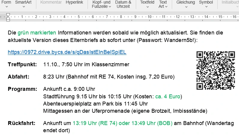 Für den anstehenden Wandertag wird ein Elternbrief verfasst, der Informationen über das Programm und die Rückkehrzeit zur Schule enthält. Zur Zeit der Erstellung steht die genaue Rückkehrzeit allerdings noch nicht sicher fest, dennoch sollen die anderen Informationen bereits jetzt geteilt werden. Der Elternbrief enthält deswegen den Hinweis, dass z. B. die Rückkehrzeit oder genaue Kosten noch aktualisiert werden.