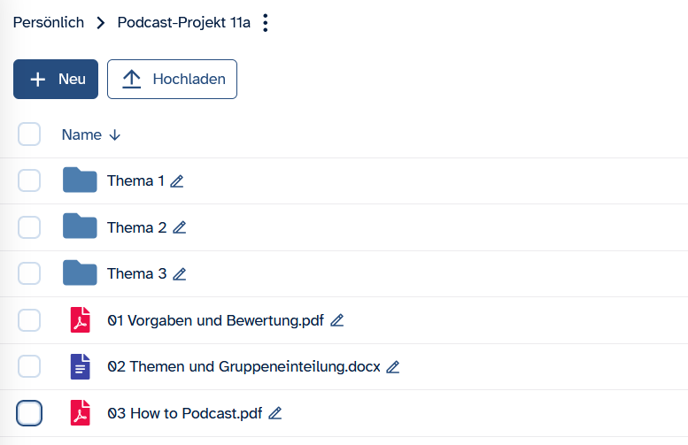 Von der Lehrkraft wird ein Ordner zum Projekt in „Persönliches” angelegt, der neben grundlegenden Informationen (inhaltliche und organisatorische Vorgaben, Hinweise zur Erstellung von Podcasts, etc.) für jede Kleingruppe einen Unterordner enthält. In diesen Unterordnern finden die jeweiligen Gruppenmitglieder die vorgegebenen Materialien und können insbesondere ihre (Zwischen-)Ergebnisse ablegen und dort kollaborativ bearbeiten.