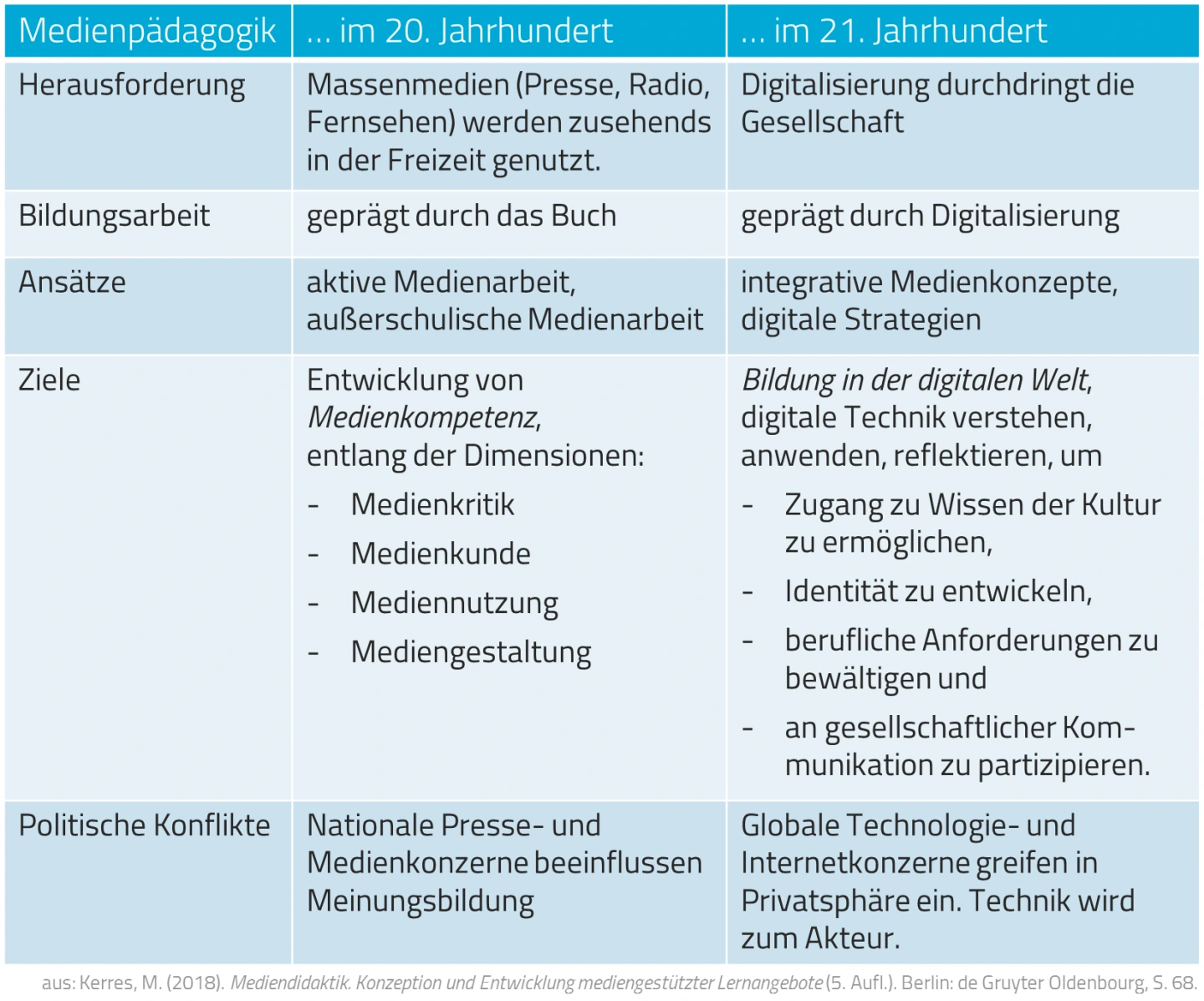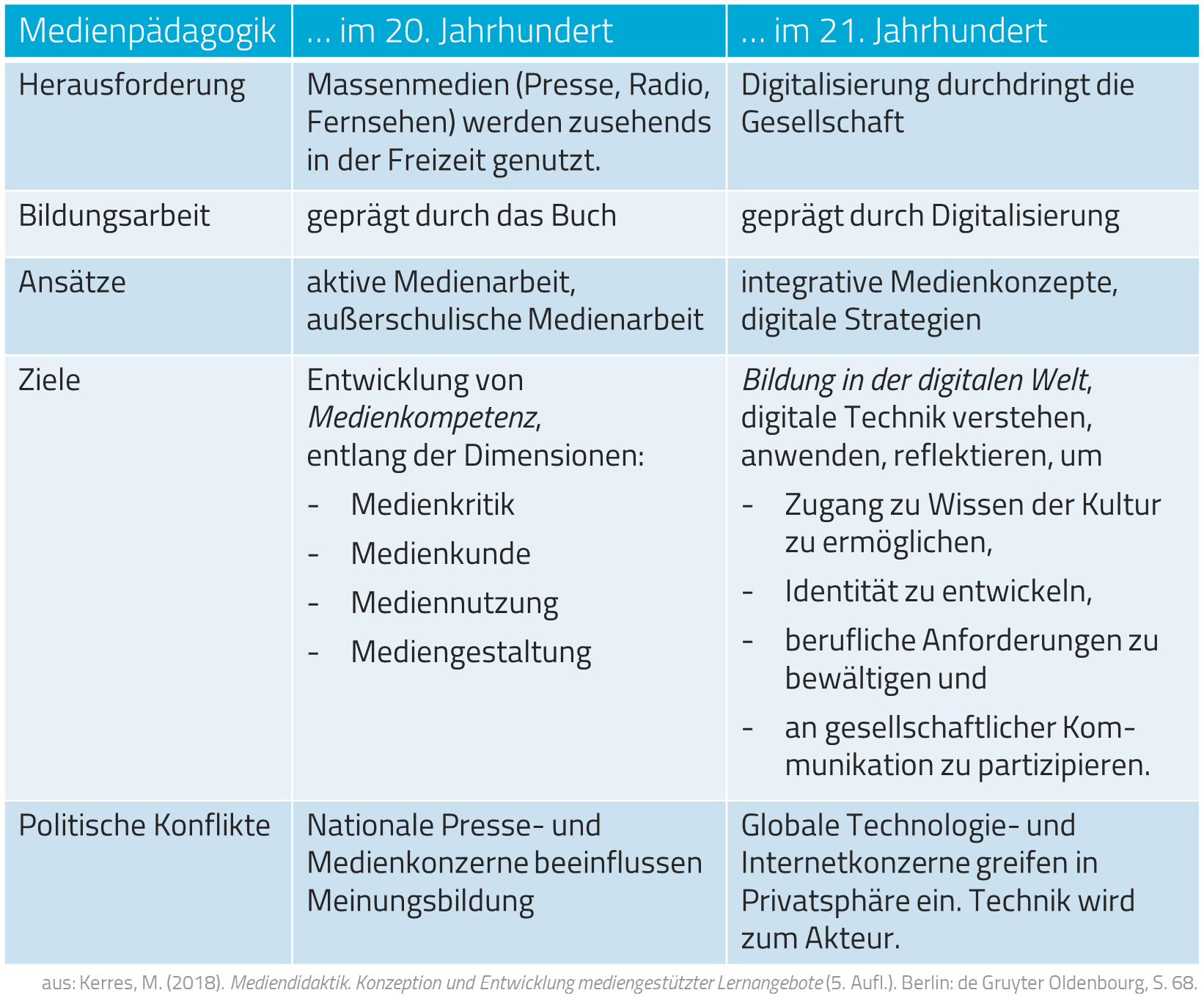 In Bildungsinstitutionen dominierte dagegen das Buch als Medium der Übermittlung von Wissen und Kultur. Es gab Schulfunk und Bildungsprogramme ihn Radio und Fernsehen, es gab bereits eine Fülle von Filmen und Bildmaterialien, die über ein geografisch verzweigtes Netz von Kreisbildstellen für Lehrende ausleihbar waren. Doch die logistischen Hürden setzten deren Einsatz im Unterricht Grenzen. Eine Übersicht, wie sich Fragen der Medienpädagogik mit der Digitalisierung verändern, zeigt die Tabelle. Verwiesen wird dort auch auf neue politische Konfliktlinien, die sich mit der Digitalisierung abzeichnen, und die Bildung in der digitalen Welt mit bedenken muss, etwa der Zugriff auf die Privatsphäre des Einzelnen und die Rolle von Technik als Akteur im gesellschaftlichen Geschehen.