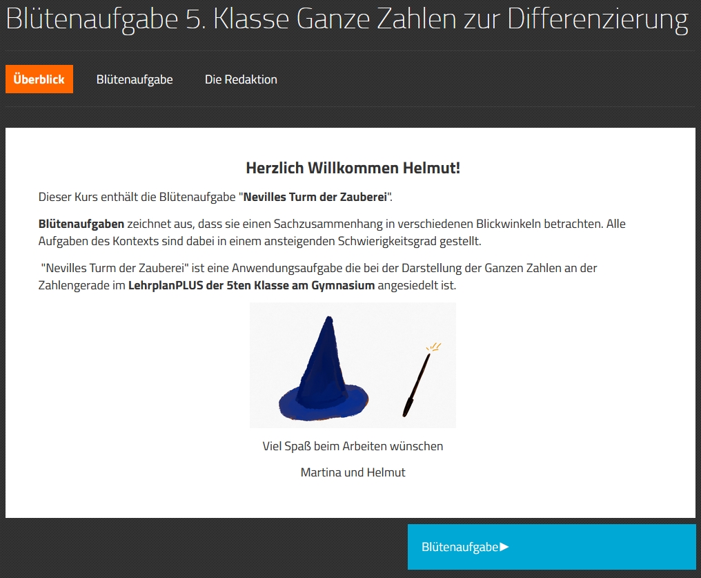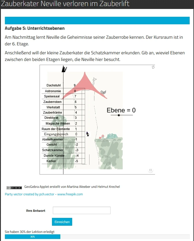 Das zentrale Element des Kurses bildet die Lektion „Zauberkater Neville verloren im Zauberlift”. Diese stellt die Rahmenhandlung dar: Neville ist gerade neu an die Zauberschule gekommen muss sich orientieren, um alle Unterrichtsräume zu finden. Dabei hilft ihm ein magischer Lift. Die Lektion bietet als interaktive Visualisierung ein GeoGebra-Applet, mit dessen Hilfe man Nevilles Fahrten im Zauberlift von Ebene zu Ebene nachvollziehen kann.
