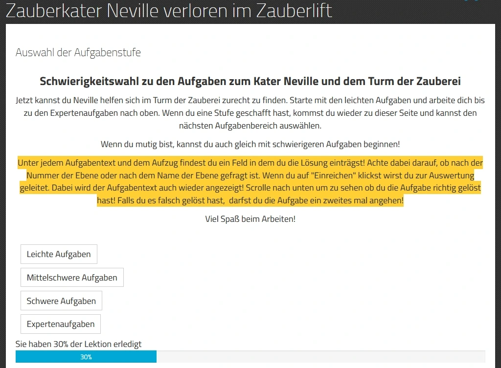 Die Lösung der Aufgabe ist entweder eine Ebenen-Nummer oder ein Stockwerksnamen. Alternativ sind aber auch Multiple-Choice-Aufgaben möglich. Die Aufgabenstellungen werden dabei immer komplexer und verlangen von den Schülerinnen und Schülern Textverständnis, Problemlösefähigkeit und Verständnis für das Arbeiten mit der Zahlengerade. Mit dem Lösen der Expertenaufgabe schließen die Schülerinnen und Schüler die Lektion schließlich ab.