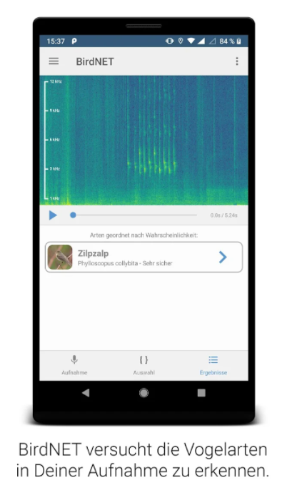 BirdNET ist das Pendant zu Flora Incognita zur Vogelbestimmung. Im Gegensatz zur Bildanalyse erfolgt bei dieser App, die von Wissenschaftlern der TU Chemnitz und dem Cornell Lab of Ornithology entwickelt wurde, die Analyse über die Audioaufnahme von Vogelgezwitscher. Die selbst erstellte Datenbank kann auch zum Training der Vogelstimmen genutzt werden und Beobachtungen werden geolokalisiert gespeichert. Dieser Datenschatz hilft Wissenschaftlerinnen und Wissenschaftlern etwa Dialekte und Imitationen von Vogelarten besser zu erkennen und somit Rückschlüsse auf den Zugweg und die Vermischung von isolierten Populationen zu erhalten. Interessant ist hier auch der Einsatz von künstlicher Intelligenz zum Erkennen von Mustern in den Sonagrammen.