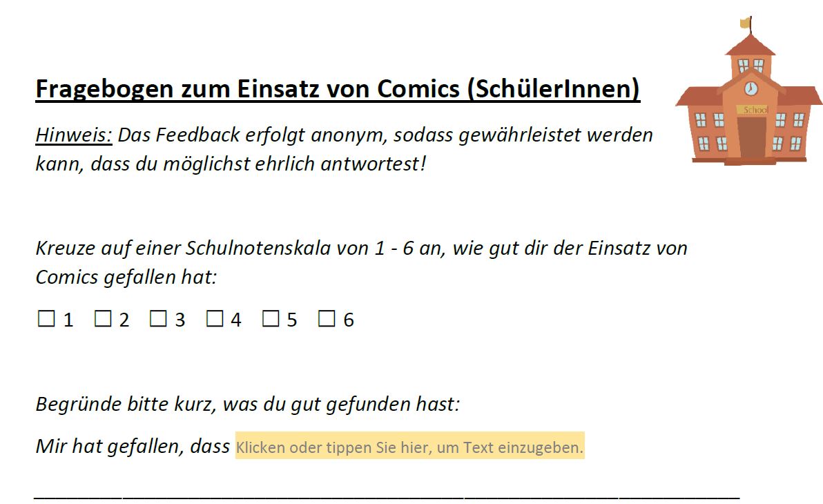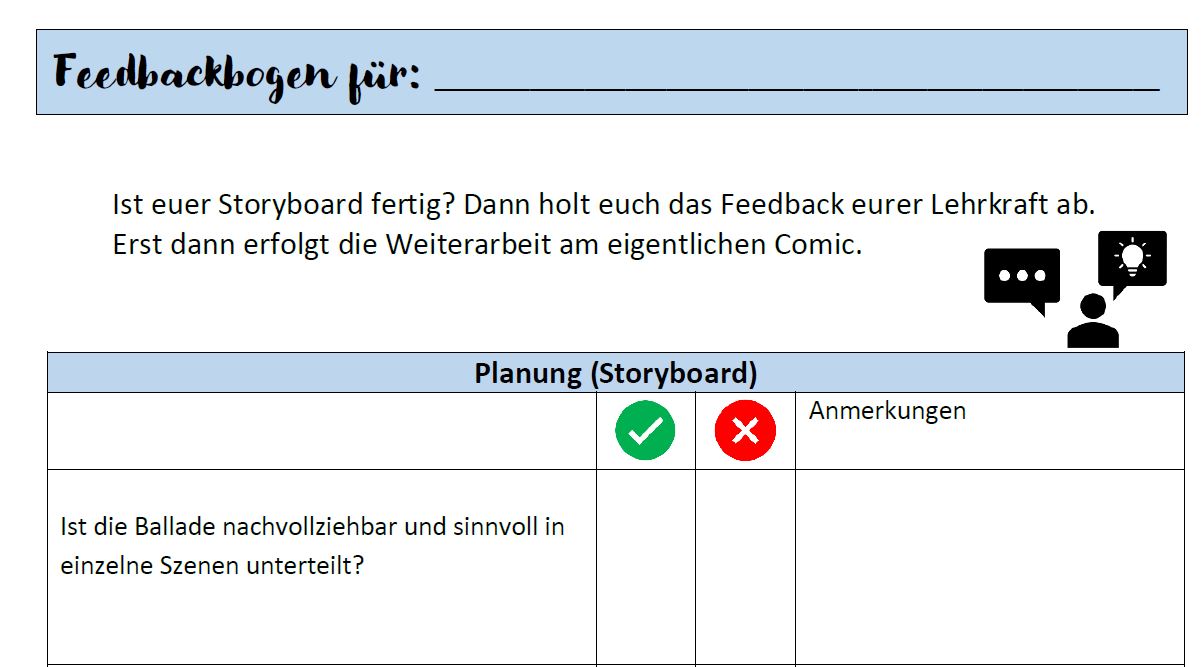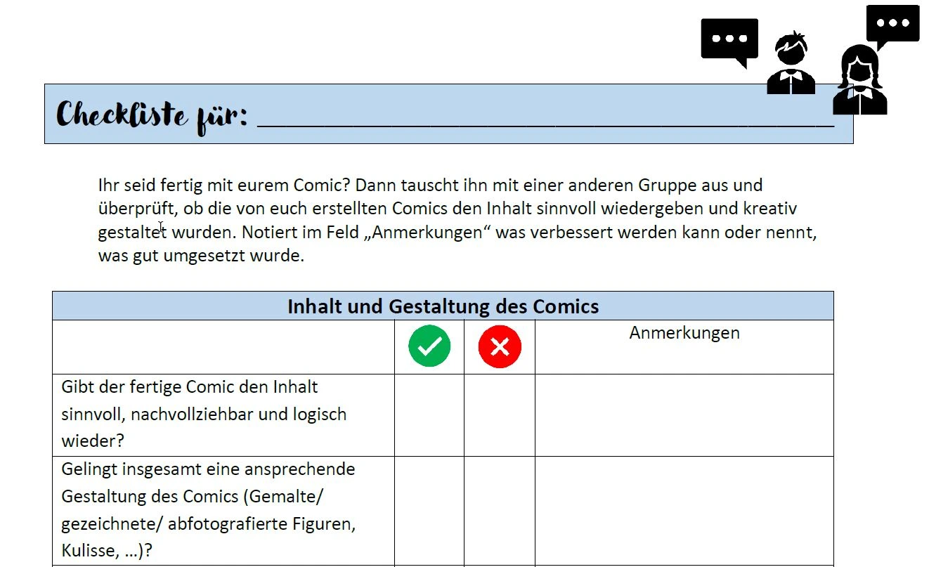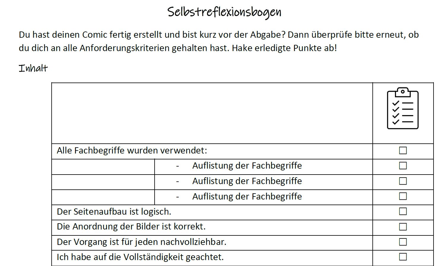 Die Reflexion des erarbeiteten Endprodukts ist ein gängiges Hilfsmittel, um die kommunizierten Anforderungskriterien präsent zu halten und die Schülerinnen und Schüler aufzufordern, diese mit ihrem Produkt abzugleichen. So können fehlende Inhalte erkannt und eventuell noch ergänzt werden. Aber nicht nur die Lernenden reflektieren ihren Arbeitseinsatz, ebenso können Feedbackbögen der Lehrkraft helfen, den Einsatz der Methode Comic auf ihre Effektivität hin zu überprüfen. Dies ist als Selbstreflexion möglich, aber auch durch ein anonymisiertes Befragen der Schülerinnen und Schüler.