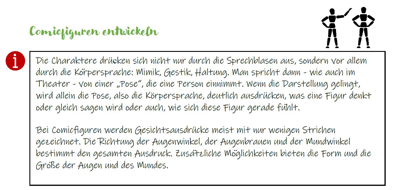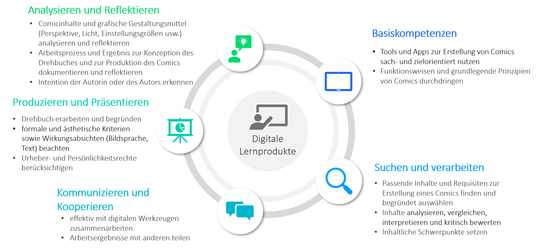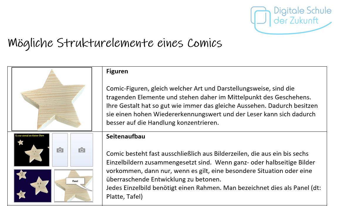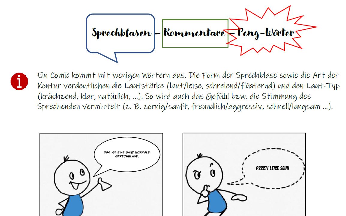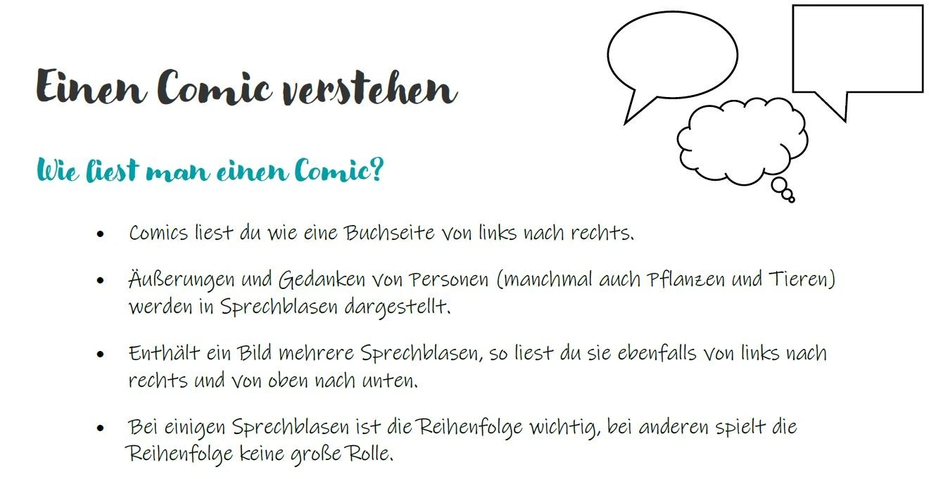 Comics sind eine Abfolge von Bildern (sogenannte „Panels“), die einen Vorgang oder eine ganze Geschichte erzählen. Man kann sie im Unterricht einsetzen, um bestimmte Inhalte zu erschließen oder bereits Erlerntes zu festigen und zu vertiefen. Darüber hinaus sollen die Schülerinnen und Schüler lernen, Comics zu analysieren und abschließend zu reflektieren, welche Intentionen des Erstellenden dahinterstecken.