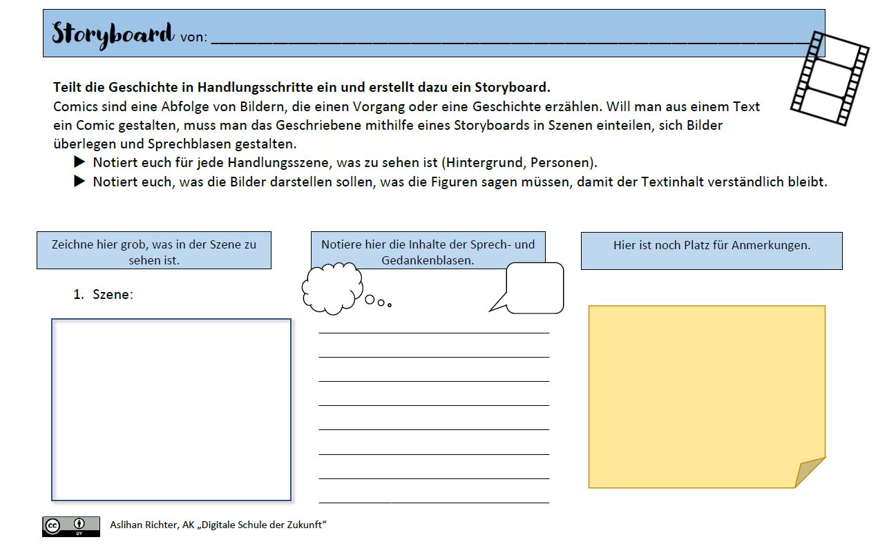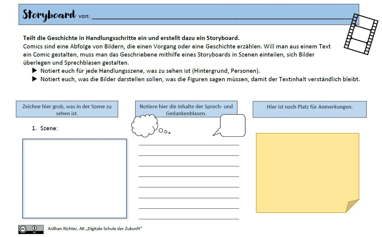 Entscheidet man sich für einen Comic, so kann zuerst einmal ein Storyboard, d.h. eine Skizze, erstellt werden. Dies erfordert intensives Lesen und es besteht die Notwendigkeit, sich in der Gruppe zu einigen, welche Episoden eines selbstgewählten oder von der Lehrkraft vorgegebenen Themas dargestellt werden sollen.