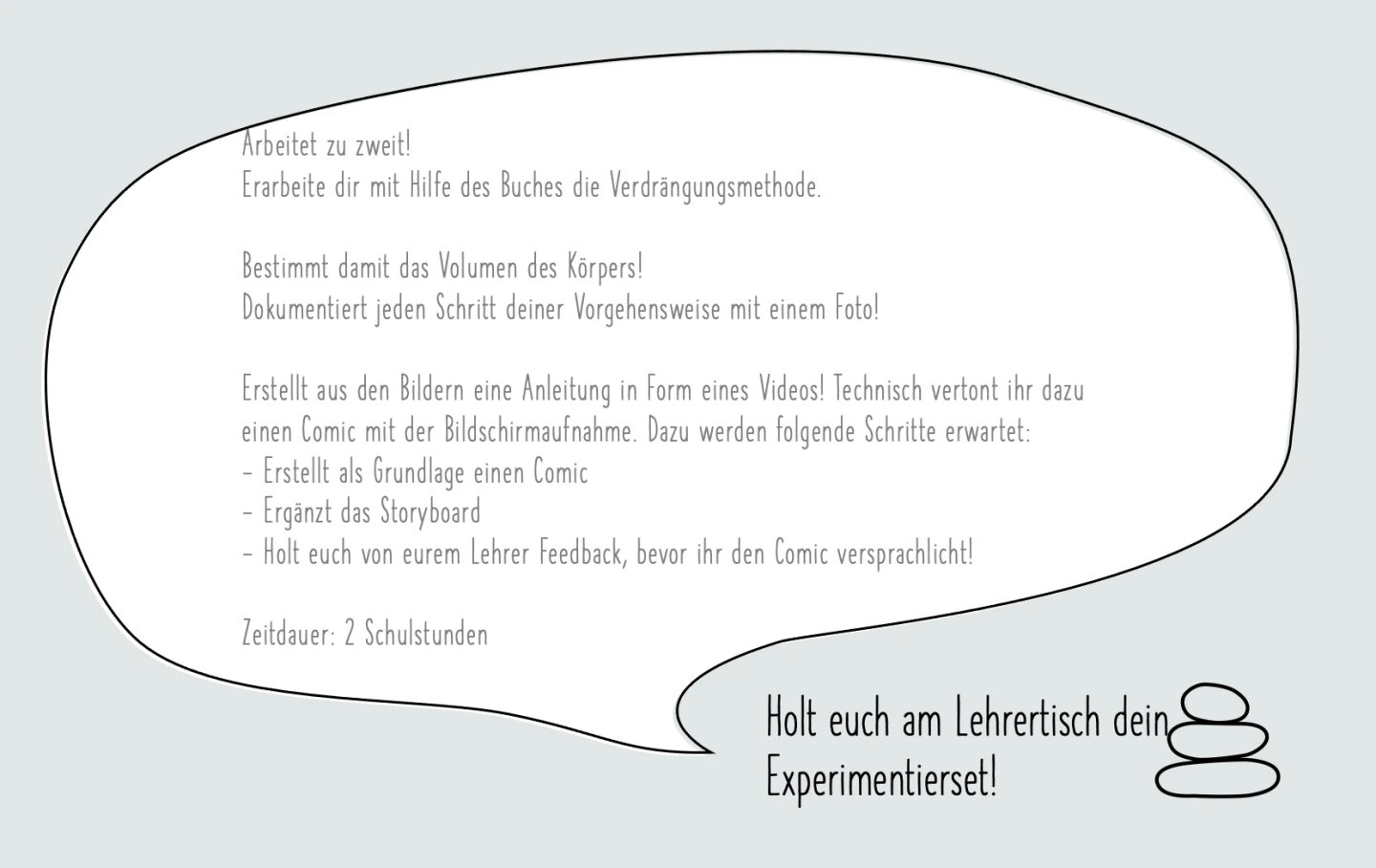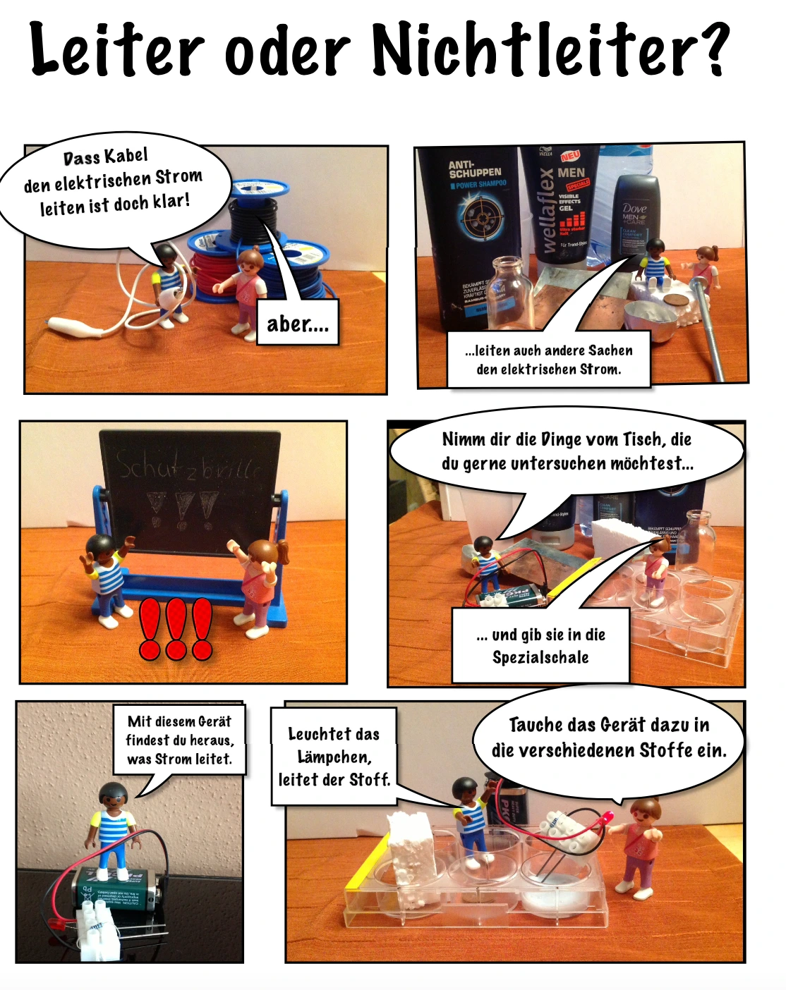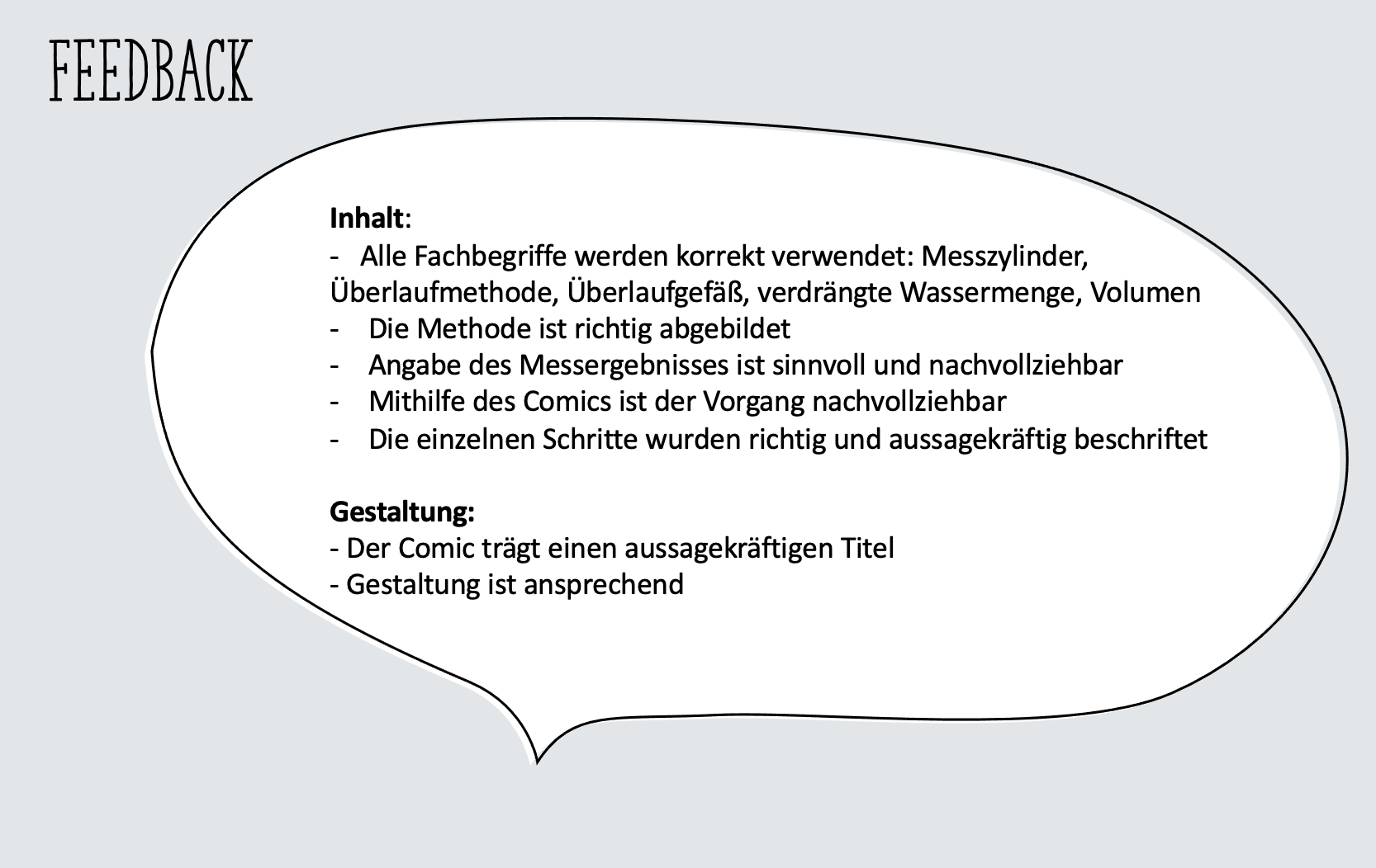 Hier wurde die Vorgangs- bzw. Versuchsbeschreibung (z. B. aus dem Lehrbuch) vorgegeben, mit dem ergänzenden Arbeitsauftrag, einen Comic des Versuchs zu erstellen.