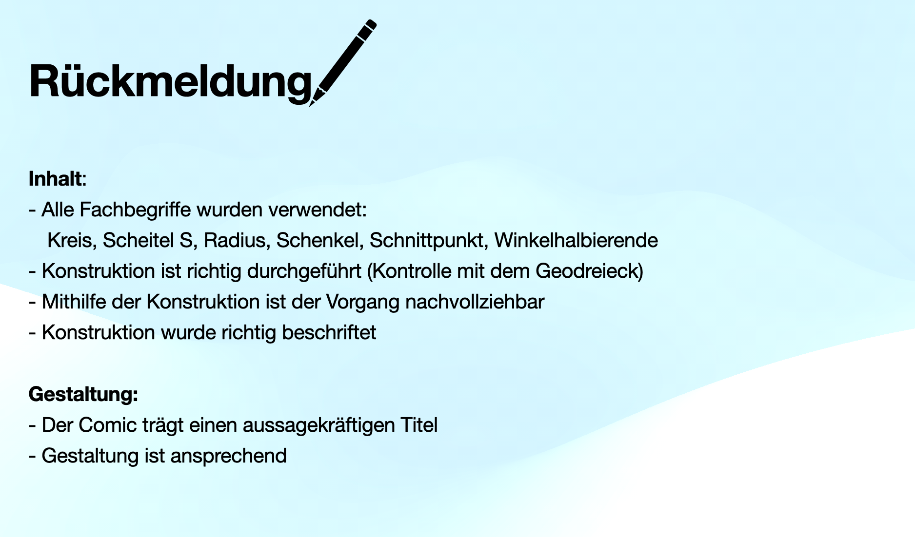 Da es sich um vergleichsweise recht aufwendige Lernprodukte handelt, sollten die Lernenden die Möglichkeit haben, in verschiedenen Arbeitsphasen Feedback einzuholen, so zum Beispiel zu den Vorprodukten und Konzepten, bevor sie mit der eigentlichen Erstellung des Films beginnen.