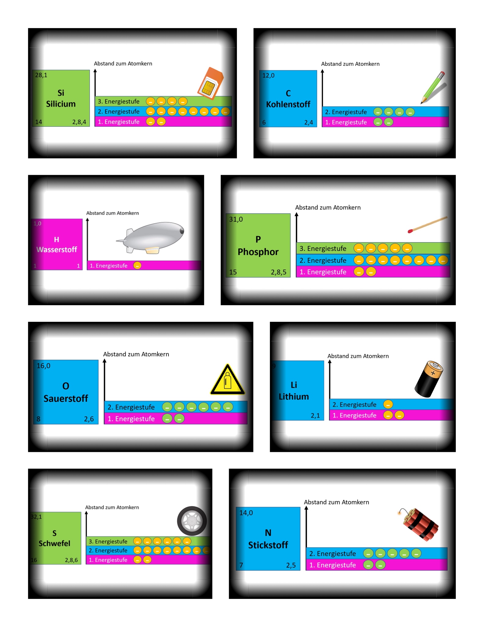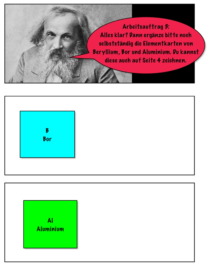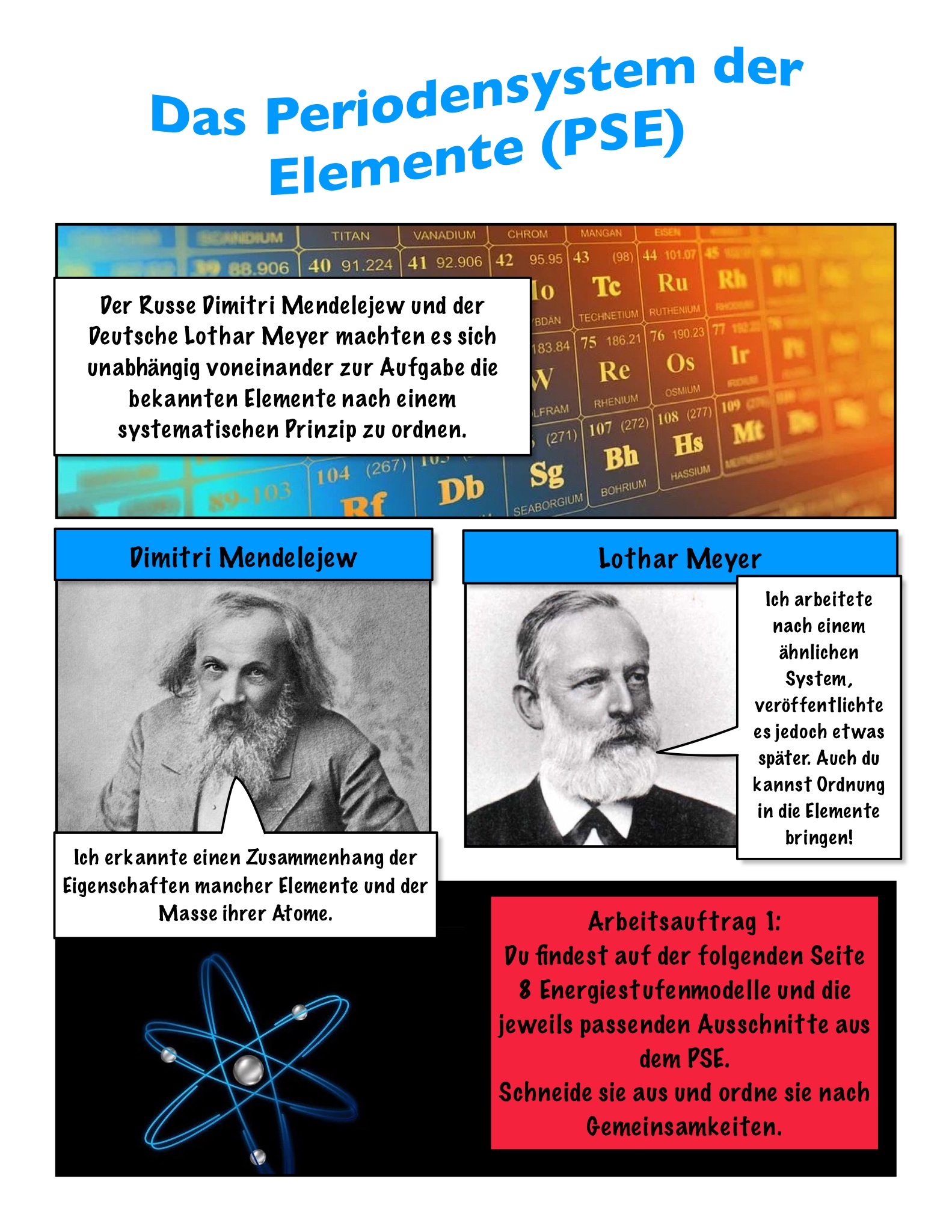 Der Arbeitsauftrag wird hierbei von historisch relevanten Personen gestellt, um den geschichtlichen Hintergrund zusätzlich abzubilden. Die Entdecker des Periodensystems (PSE) der Elemente fordern die Schülerinnen und Schüler auf, ihre Erkenntnisse in einer Arbeitsphase nachzuvollziehen. Hierbei ist durch die Farbgebung oder die genaue bzw. nicht vollständige Angabe der Energiestufenmodelle eine Differenzierung möglich.