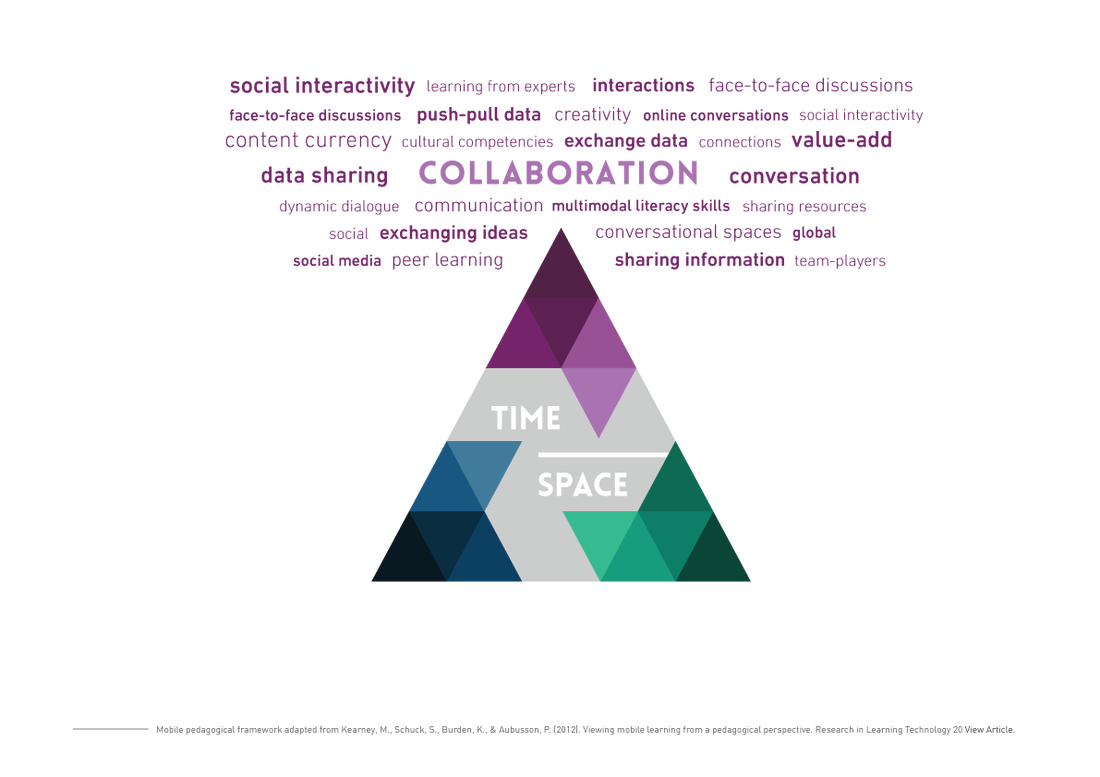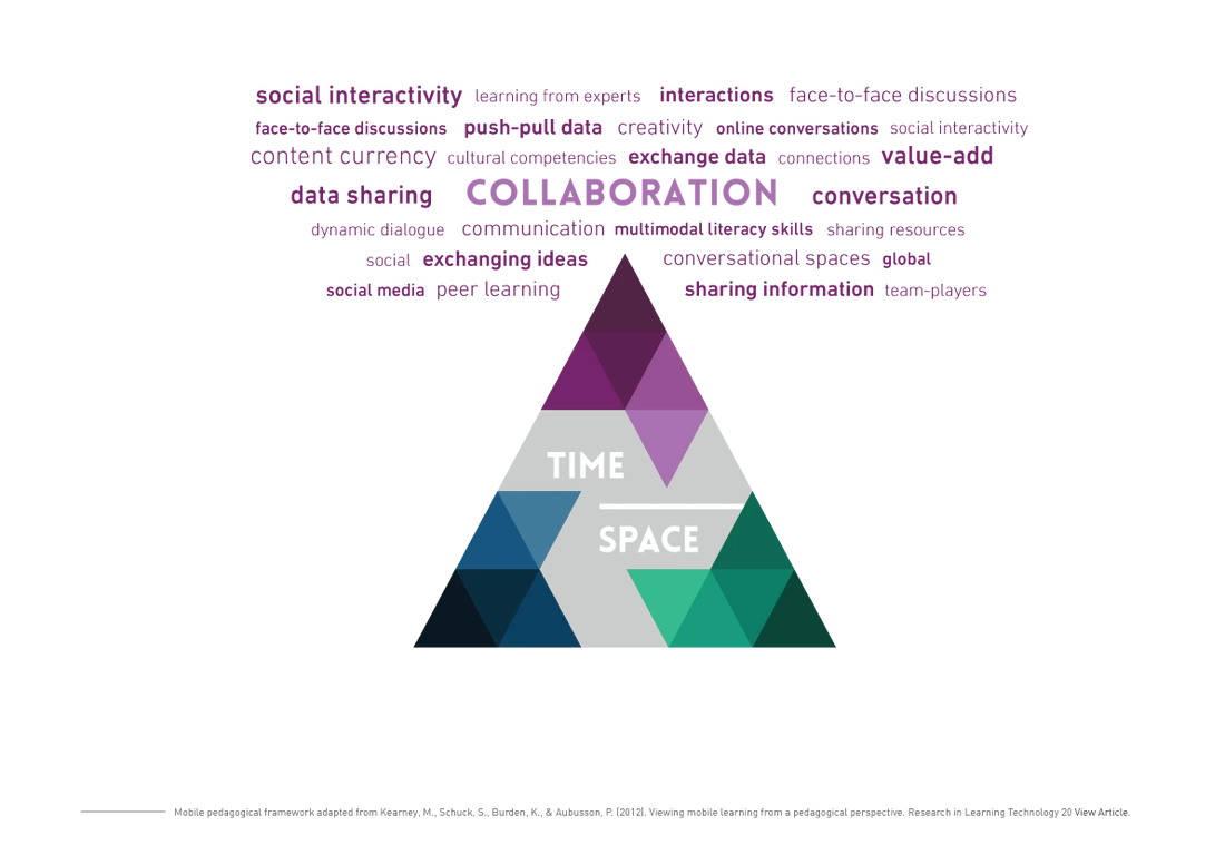 Mobile Endgeräte erlauben es Lernenden nicht nur, Netzwerke zu bilden und sich in diesen zu bewegen, sondern auch ein hohes Maß mit Mitschülerinnen und Mitschülern zusammenzuarbeiten, und mit Lehrkräften, Peers und externen Expertinnen und Experten zu kommunizieren. Die Kollaboration wird gemessen an der Art der Interaktionsform (Conversation) und der Intensität des Datenaustauschs (Data Sharing).