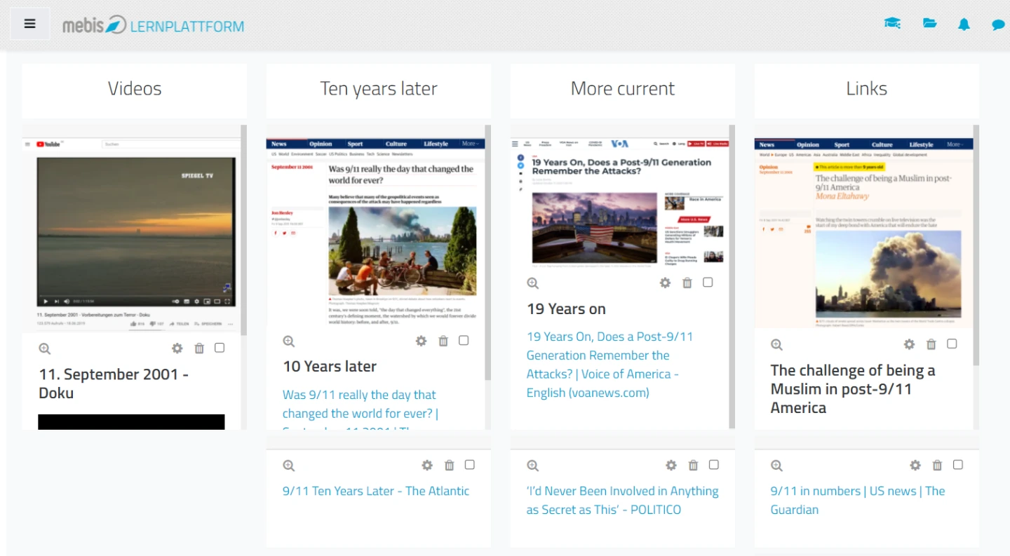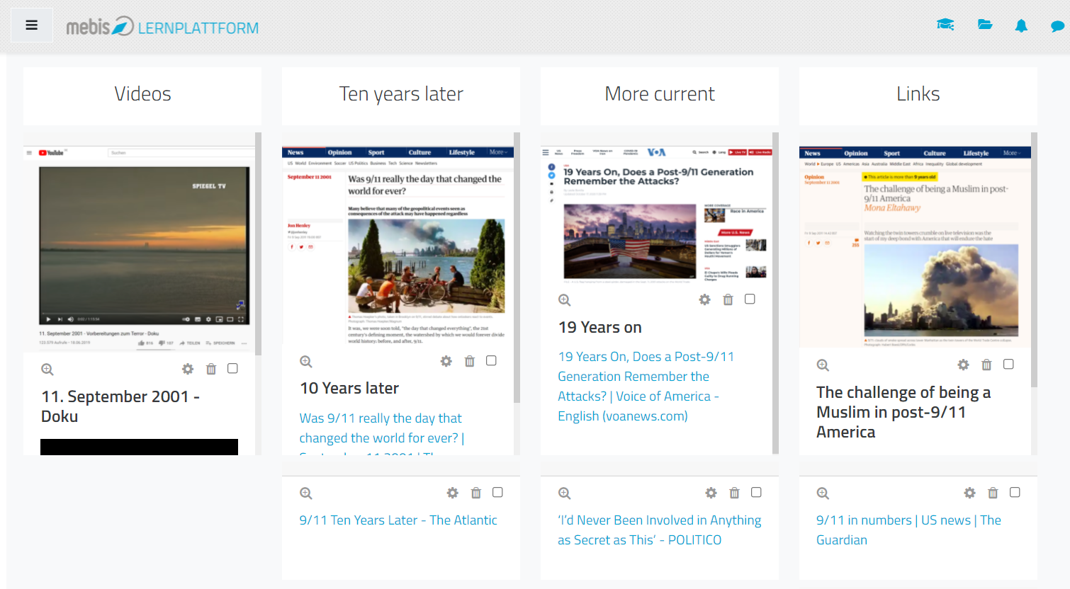 Durch die Wahl eines geeigneten Vorlagensatzes kann im Rahmen der Aktivität „Datenbank” eine digitale Pinnwand als kooperative Möglichkeit verwendet werden, den Unterrichtsstoff gemeinsam zu erarbeiten. Hierbei können vorgefertigte Karten durch die Lernenden mit Texten, Videos oder Links befüllt werden. Jede bzw. jeder Lernende hat so die Möglichkeit, Einträge selbst zu erstellen oder auf von der Lehrkraft vorgefertigte Kärtchen zu schreiben.