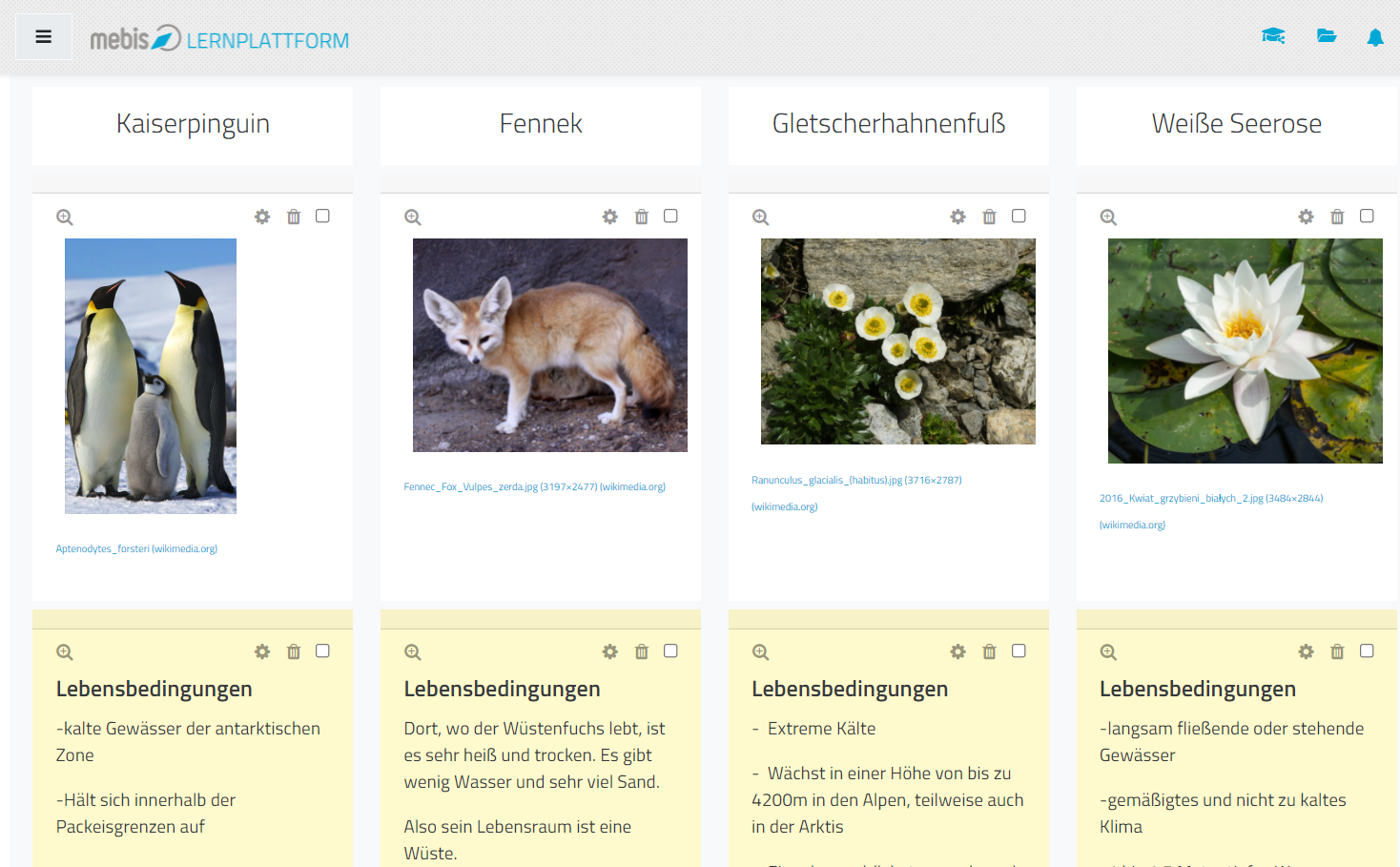 Die Lehrkraft kann auch bereits vorab Karten mit Zwischenüberschriften erstellen (hier z. B. „Lebensbedingungen”) und diese auch mit einer einheitlichen Färbung hinterlegen. Die Schülerinnen und Schüler bearbeiten anschließend direkt über das Zahnradsymbol den Inhalt, statt die Karte samt Inhalt über „Eintrag hinzufügen” selbst zu erstellen. So kann mit einfachen Mitteln innerhalb von mebis ein kollaborativ erstelltes Tafelbild aus einer Gruppenarbeit heraus entstehen.