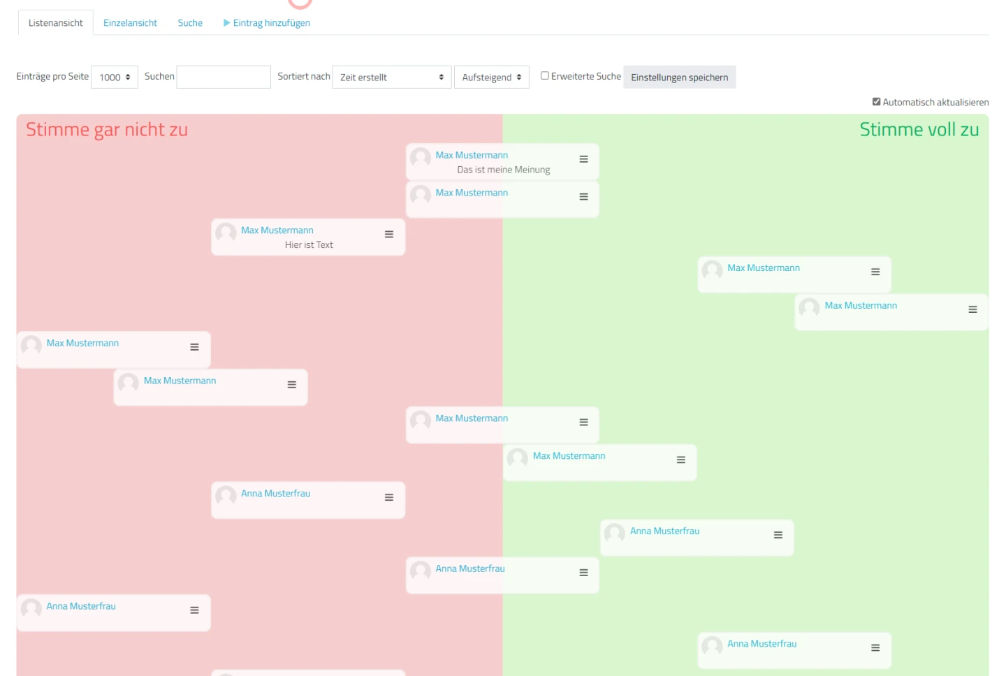 Mit der Sortierfunktion können sich Schülerinnen und Schüler in meinungsgleiche Gruppen zusammenfinden. In den Gruppen können zum Beispiel ausformulierte Argumente erarbeitet werden.