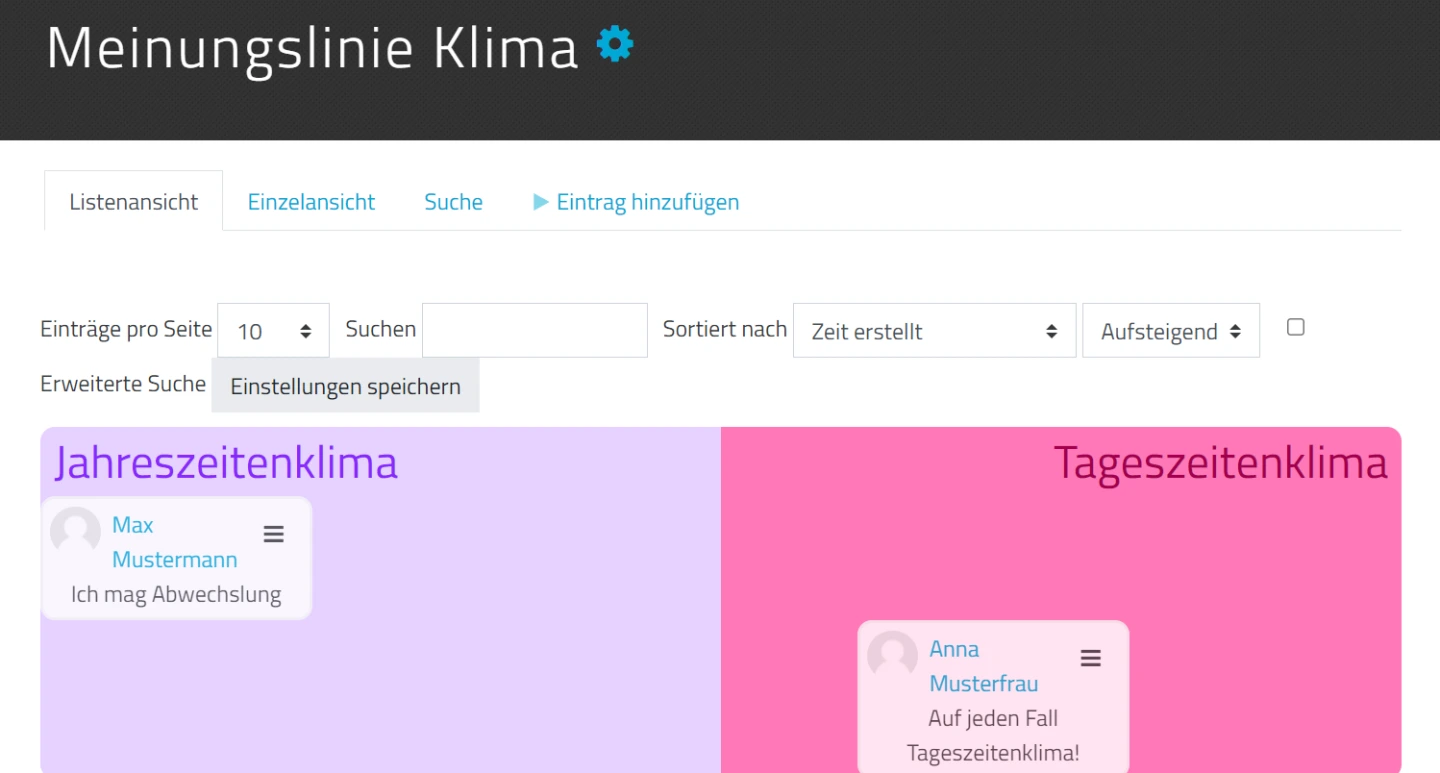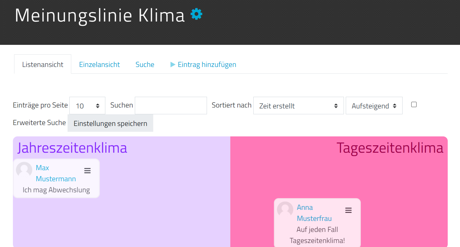 Die Meinungslinie kann dazu genutzt werden, spontane Meinungen durch reflektierte Meinungen zu unterscheiden. Diskutieren Sie zunächst das Ergebnis der spontanen Meinungsfindung und lassen Sie das Thema vertiefend bearbeiten. Anschließend können Sie in der Datenbank die einzelnen Einträge durch die Lernenden bearbeiten lassen oder wiederholen Sie die Meinungslinie mit einer neuen Datenbank-Aktivität.