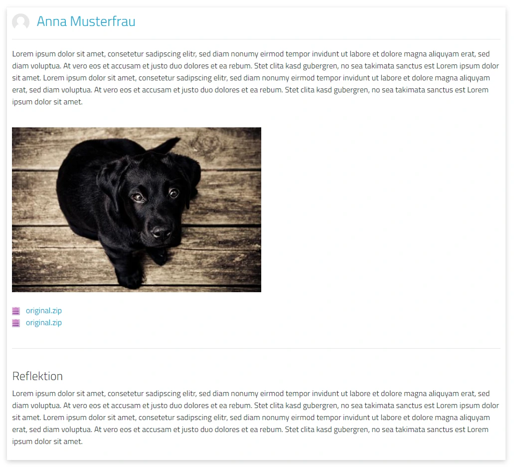 Das bedeutet: die Schülerinnen und Schüler können umfassende Inhalte in ein Textfeld eingeben, zusätzlich ein Bild und zwei Dateien hochladen. Die Reflexion erfolgt am Schluss in einem zweiten Textfeld.