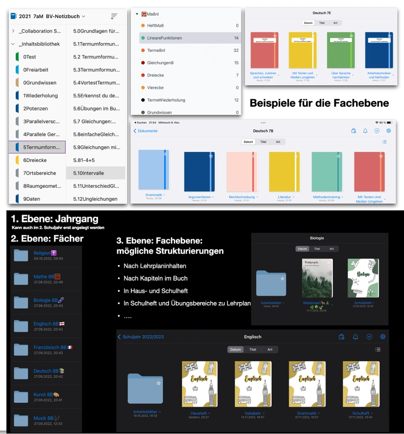 Gemeinsam mit den Lernenden sollte eine verbindliche Grobstruktur für alle Fächer angelegt werden, die den Schülerinnen und Schülern eine Gesamtübersicht über die Jahrgangsstufen und Fächer bietet. Auch auf Ebene der Fächer ist eine Strukturierung nötig. Dabei können sich je nach Fach verschiedene Unterstrukturen ergeben. Bei der Entwicklung struktureller Vorgaben muss berücksichtigt werden, ob ein einheitliches oder offenes Konzept gewählt wurde oder ob eine Notizen-App nur zur Unterstützung des Unterrichts genutzt wird.