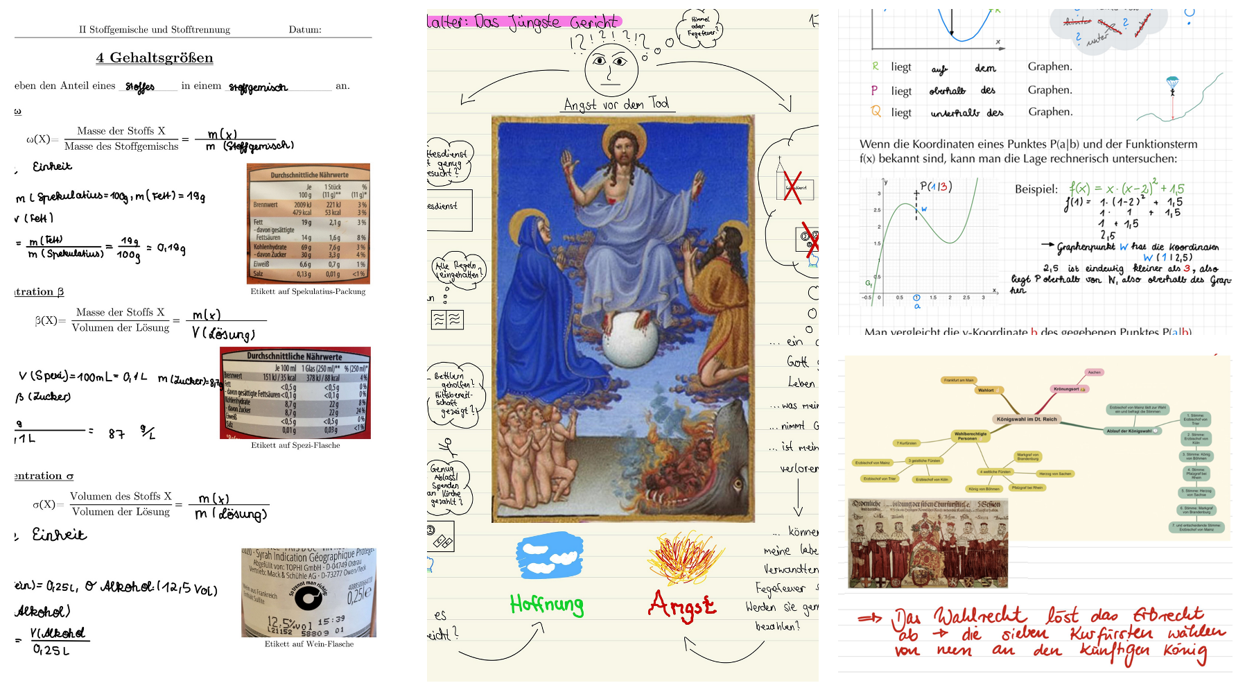 Das digitale Heft macht es den Lehrkräften und Lernenden je nach genutzter Notizen-App möglich, sich bei der Unterrichtsdokumentation entweder ganz vom klassischen DIN A4-Format zu lösen oder vorgegebene Seiten stark zu vergrößern, sodass mehr Inhalte dokumentiert werden können. Dadurch entsteht aber die Gefahr, dass der Überblick verloren geht und die Schülerinnen und Schüler die wesentlichen Informationen nicht mehr auf einen Blick erkennen können. Bei der Erstellung der Hefteinträge sollte die Lehrkraft also immer das Endprodukt bedenken und den Fokus der Lernenden darauf lenken. Die Mitschriften sollten so gestaltet werden, dass extremes Zoomen vermieden wird und die Schülerinnen und Schüler bei der Gestaltung altersgerecht angeleitet werden. Je nach Umfang und Komplexität des Unterrichtsgegenstandes kann es beispielsweise auch sinnvoll sein, auf eine digitale Dokumentation zu verzichten und die Inhalte stattdessen analog festzuhalten.