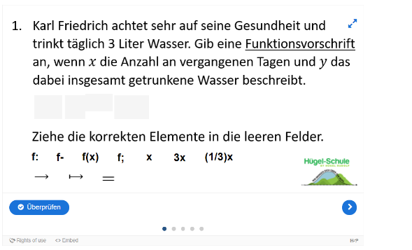 In den Kapiteln zu „Linearen Funktionen“ und „elementaren gebrochen-rationalen Funktionen“ werden zudem duale Übungsblätter angeboten. Ein Großteil der Aufgaben kann dabei von den Lernenden selbstständig überprüft werden, ohne dass die Lösungen grundsätzlich einsehbar sind. Alternativ können die entsprechenden Aufgaben auch direkt in einem durch H5P-erstellten digitalen Aufgabenblatt gelöst werden.