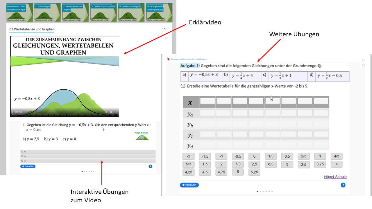Begleitend zu jedem Lernvideo bietet die Hügel-Schule verschieden Möglichkeiten zur Ergebnissicherung und Übung an.