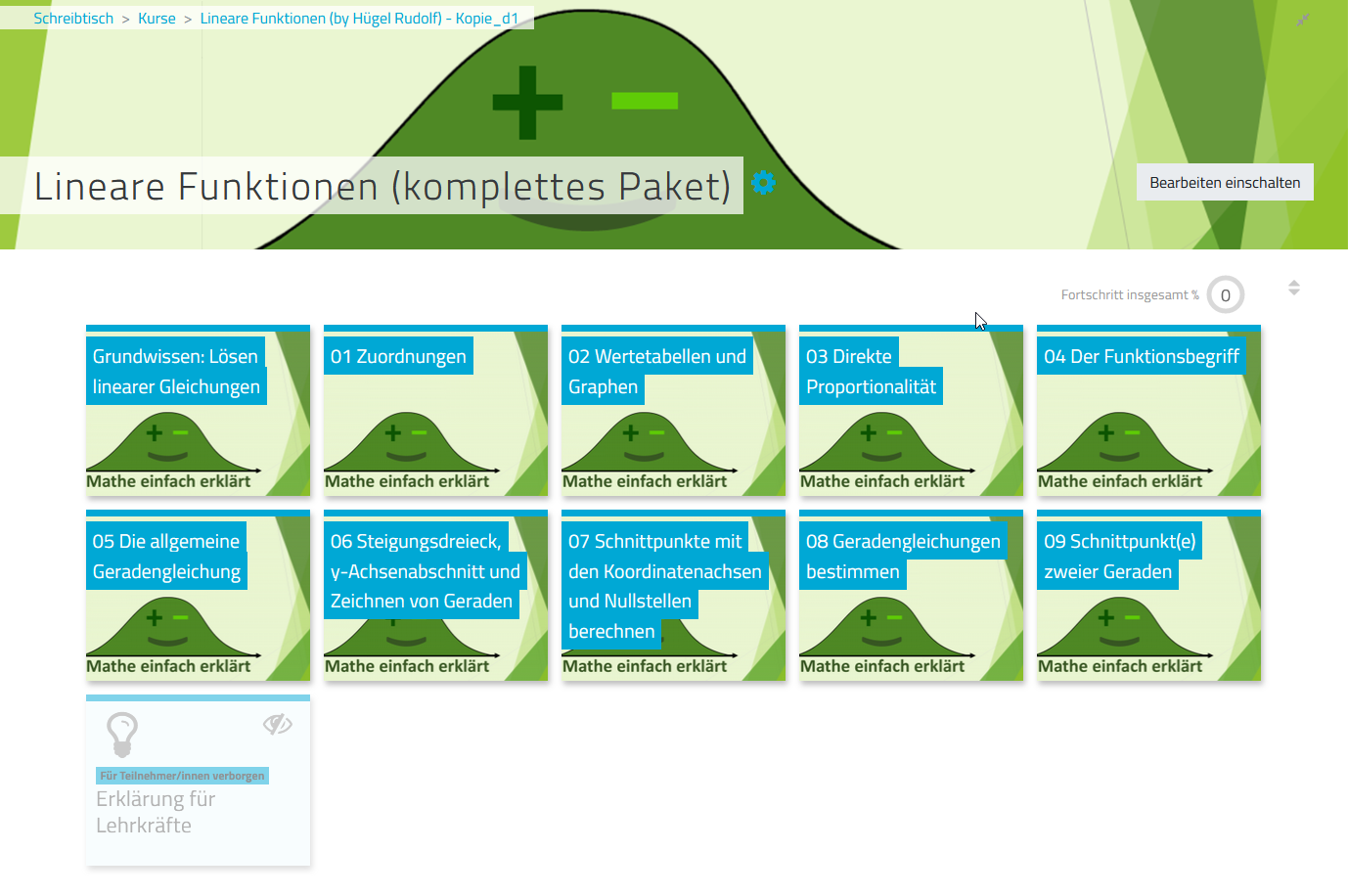 Der Kurs ist im Kachelformat angelegt, so dass eine übersichtliche Abgrenzung der einzelnen Themen stattfindet. Lehrkräfte können auch einzelne Kapitel ausblenden und erst ab einem gewünschten Zeitpunkt anzeigen lassen. So kann die Reihenfolge der Bearbeitung auch beliebig bestimmt werden.