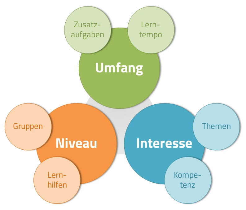 Die Möglichkeit der eigenständigen Auswahl von Themen unterstützt die Schülerinnen und Schüler in ihrem Autonomieerleben und erhöht gleichzeitig deren Motivation. Außerdem kann so der lebensweltorientierte Anwendungsbezug passgenauer hergestellt werden. Bei der Differenzierung nach Inhalten rückt der Kompetenzerwerb in den Vordergrund.