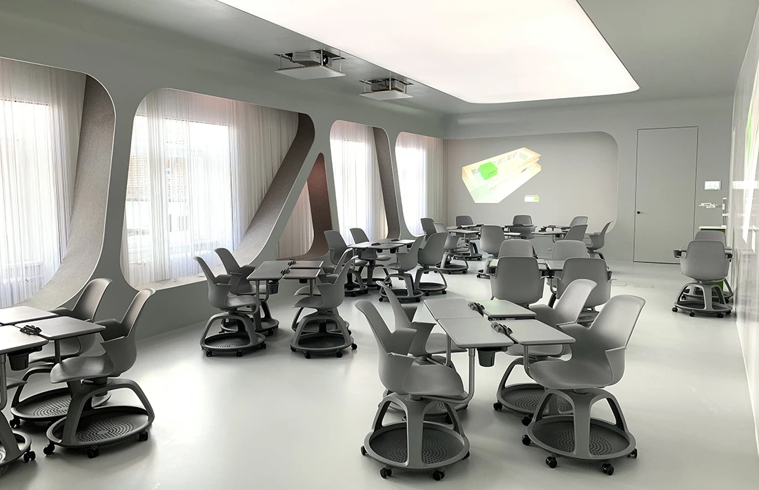 Die fahrbaren Stühle gleiten nahezu lautlos über einen speziellen Boden. Konferenzbestuhlung, Kinobestuhlung und Sitzkreis lassen sich schnell herstellen - ein Wechsel der Sozialform ist somit jederzeit unkomplizert möglich. Dabei kann auch der Außenbereich der Raumschale genutzt werden, etwa für Gruppenarbeiten.
